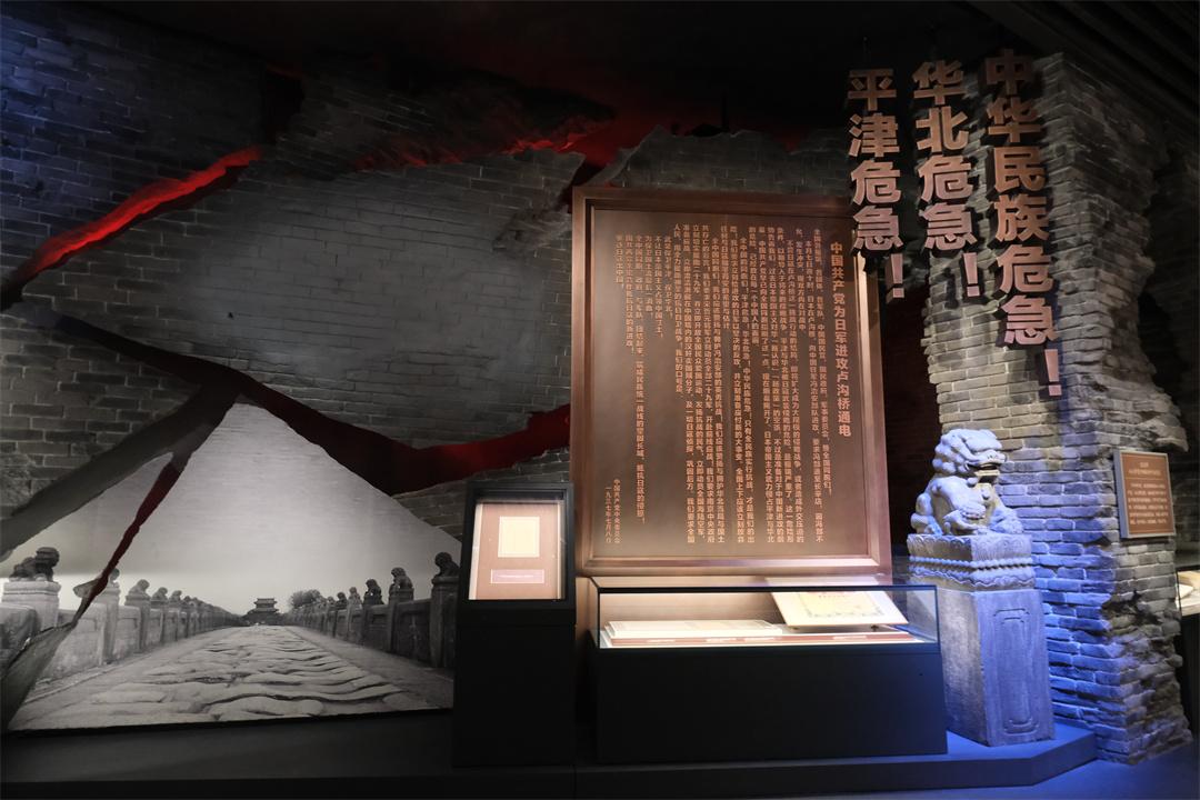 “全中國的同胞們!平津危急!華北危急!中華民族危急!只有全民族實(shí)行抗戰(zhàn),才是我們的出路!”一則《中國共產(chǎn)黨為日軍進(jìn)攻盧溝橋通電》原文被放大并“搬”上展墻,一行行大字尤為醒目,字字千鈞。主題展覽第二部分“七七事變”場景,瞬間將觀眾拉回88年前的盧溝橋畔,也是很多觀眾反饋印象最深刻的場景之一。