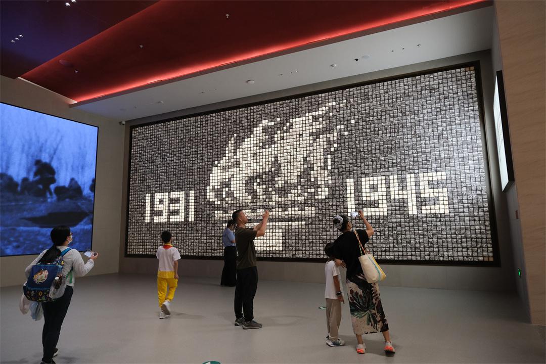 在負(fù)一層展廳扶梯旁,一面巨型照片墻將5098張抗戰(zhàn)老照片整齊排列,通過光影的明暗調(diào)節(jié),照片在墻面上緩緩流轉(zhuǎn),最終在中央勾勒出一個(gè)熊熊燃燒的巨型火炬,如同一幅橫跨14年的歷史長卷。仔細(xì)看,里面有戰(zhàn)火紛飛的場面、滿目瘡痍的城市,也有抗戰(zhàn)勝利時(shí)眾人的歡呼雀躍。