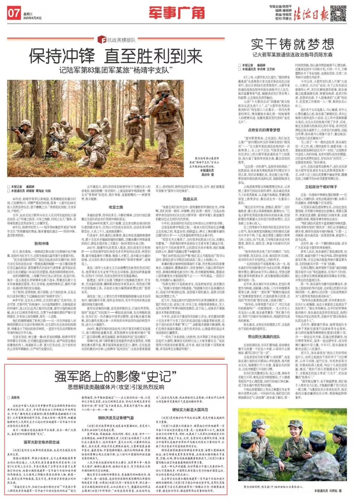 在紀念中國人民抗日戰(zhàn)爭暨世界反法西斯戰(zhàn)爭勝利80周年到來之際,近日,中央軍委政治工作部聯合中央網信辦、中央廣播電視總臺攝制的5集思想解讀類融媒體片《攻堅》,以豐富新穎的視聽手段、多維立體的一線資料,細膩描繪新時代人民軍隊全力以赴打好實現建軍一百年奮斗目標攻堅戰(zhàn)的火熱實景。