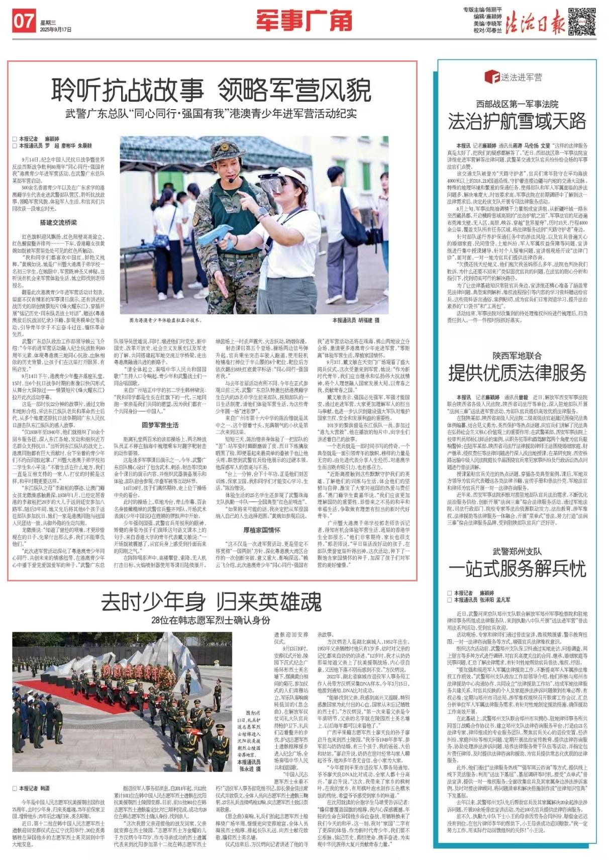9月14日,紀(jì)念中國(guó)人民抗日戰(zhàn)爭(zhēng)暨世界反法西斯戰(zhàn)爭(zhēng)勝利80周年“同心同行·強(qiáng)國(guó)有我”港澳青少年進(jìn)軍營(yíng)活動(dòng),在武警廣東總隊(duì)某部軍營(yíng)啟動(dòng)。