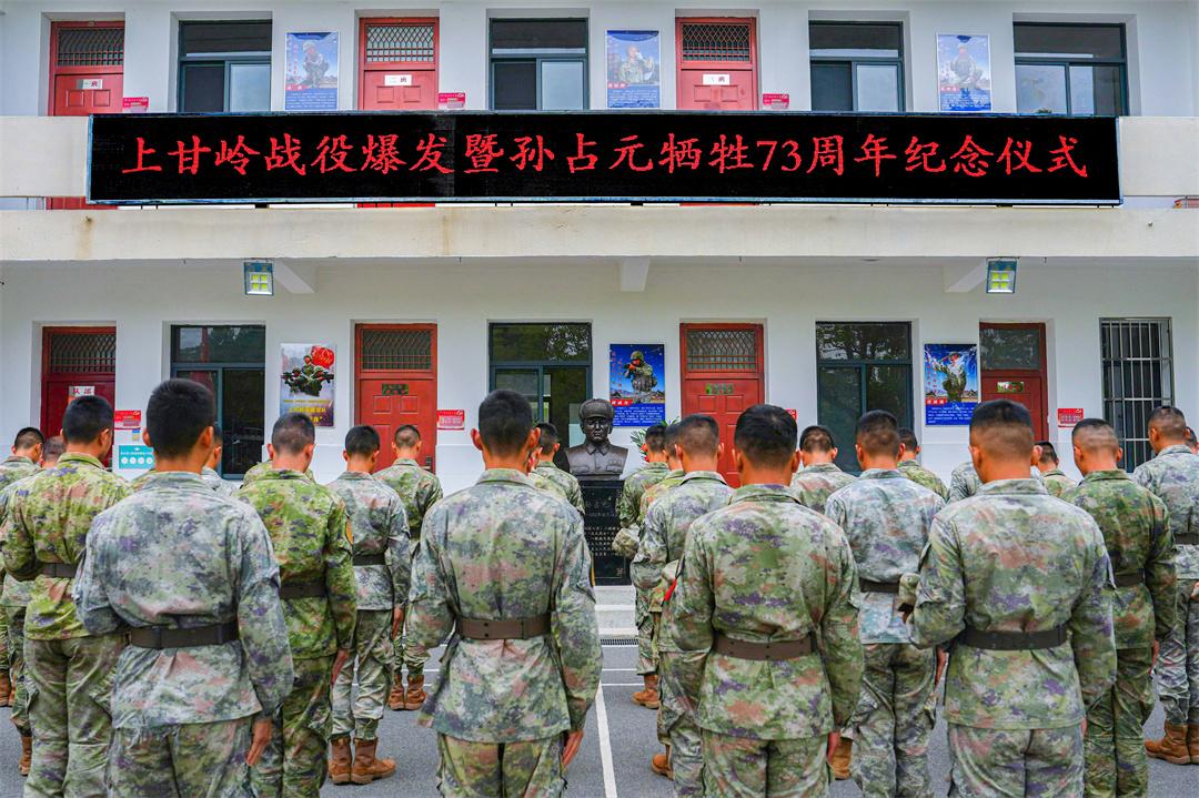 紀(jì)念儀式開(kāi)始,連隊(duì)官兵仔細(xì)整理花籃綢帶,并脫帽默哀,深切緬懷孫占元老排長(zhǎng)?;ɑ@上“紀(jì)念上甘嶺戰(zhàn)役爆發(fā)73周年”“紀(jì)念一級(jí)英雄孫占元犧牲73周年”的綢帶隨風(fēng)飄揚(yáng)。