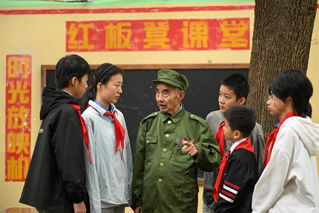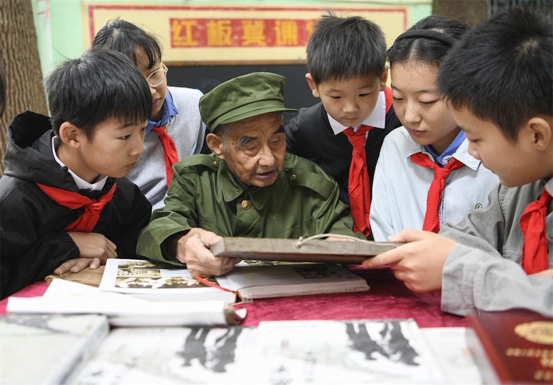 圖為孩子們和抗美援朝老兵張秉軸在一起。