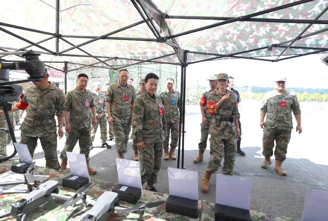 圖為觀摩特色民兵分隊無人飛行設(shè)備。