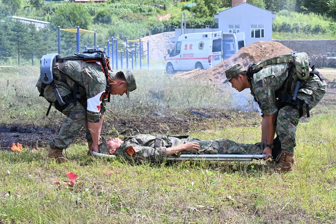 圖為“綠盾”特色民兵分隊使用外骨骼設(shè)備進(jìn)行戰(zhàn)場傷員救治課目演示。