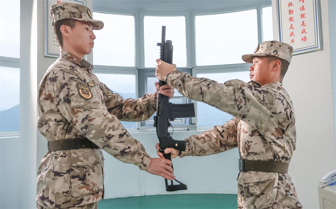 圖為官兵進(jìn)行執(zhí)勤交接哨。