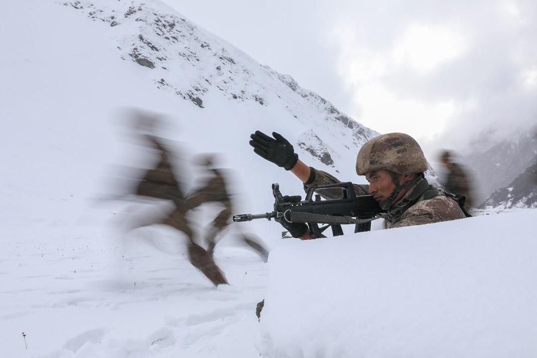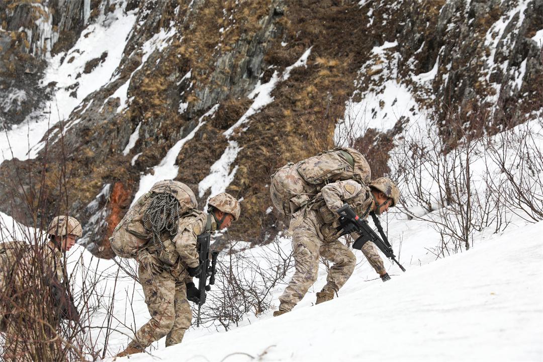 圖為寒風凜冽中,次羅布(右一)與戰(zhàn)友屈身前行攀爬險坡。