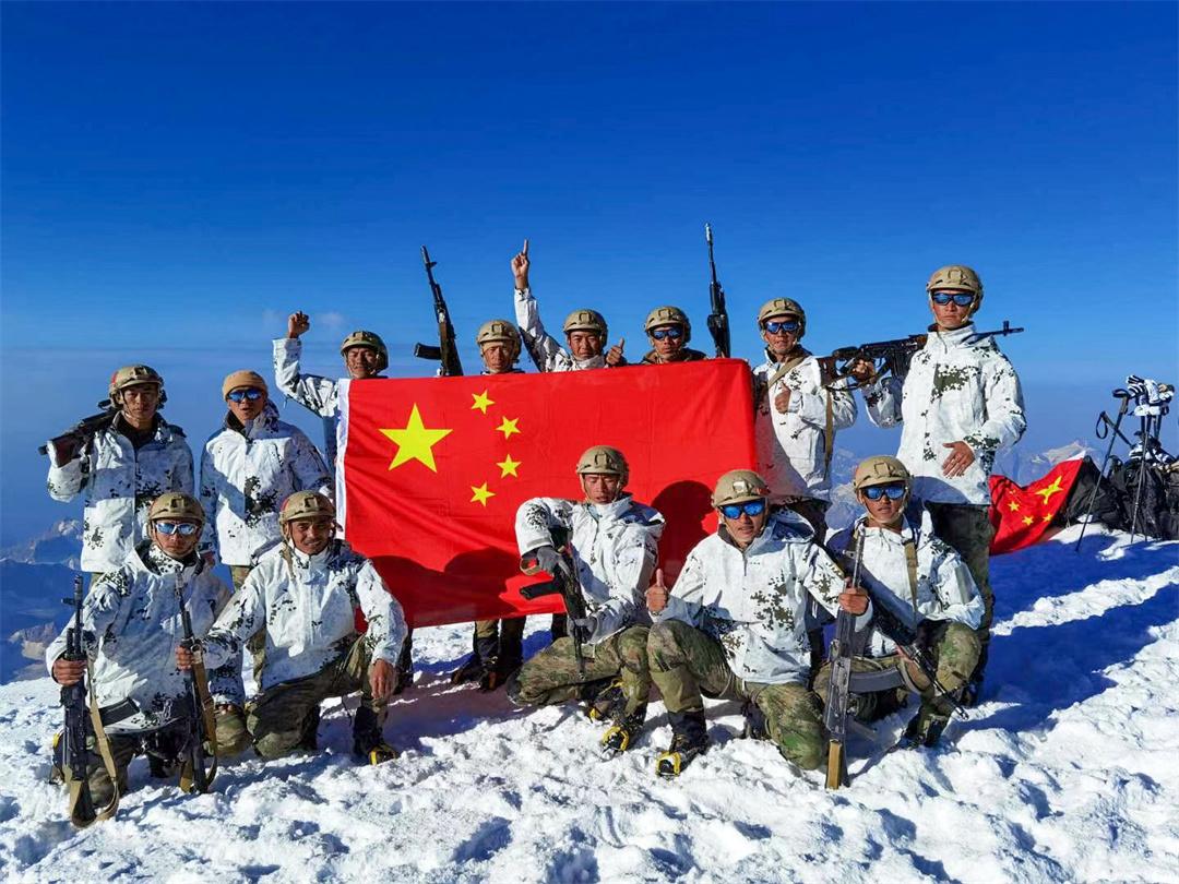 圖為次羅布(右一)與戰(zhàn)友通力協(xié)作,幫助新兵卿金科(右二)登頂雪峰。