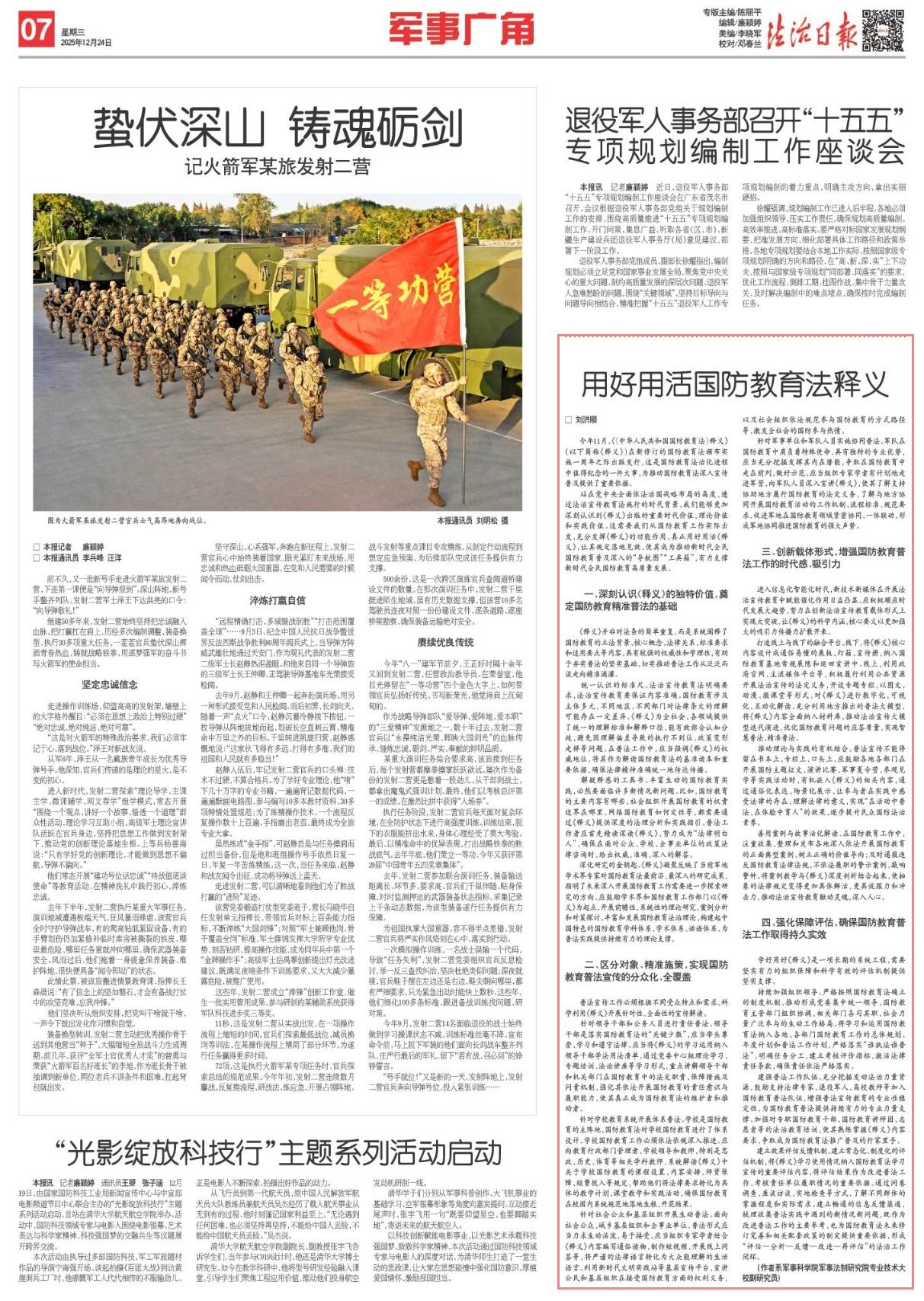 深化研究的金鑰匙?!夺屃x》凝聚反映了當(dāng)前軍地學(xué)術(shù)界專家對國防教育法最前沿、最深入的研究成果,指明了未來深入開展國防教育工作需要進(jìn)一步探索研究的方向。應(yīng)鼓勵學(xué)術(shù)界和國防教育工作部門以《釋義》為起點,開展前瞻性、系統(tǒng)性的理論研究、案例分析和對策探討,豐富和發(fā)展國防教育法治理論,構(gòu)建起中國特色的國防教育學(xué)科體系、學(xué)術(shù)體系、話語體系,為普法實踐提供持續(xù)有力的理論支撐。