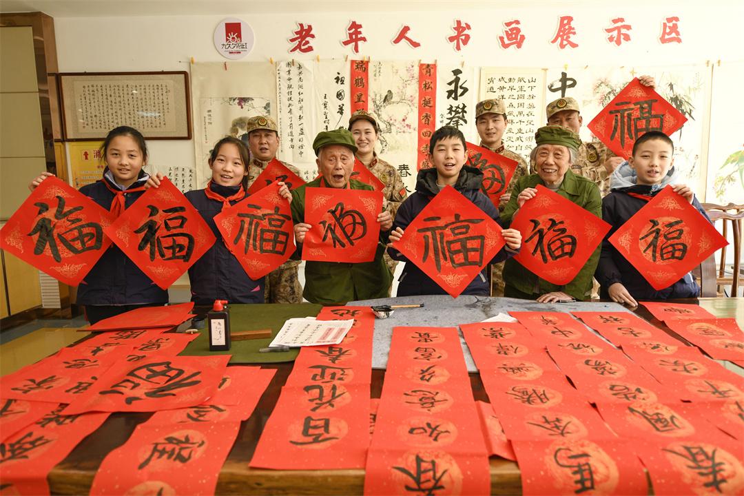 圖為小學(xué)生和抗美援朝老兵一起寫(xiě)對(duì)聯(lián)。