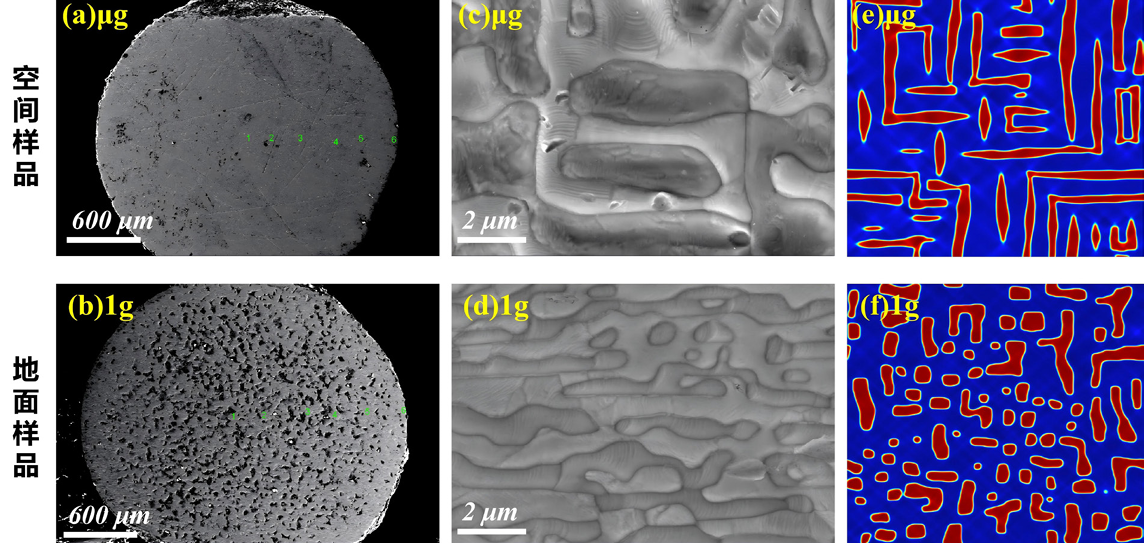 圖為空間及地面Fe-Co-B合金樣品顯微圖像與凝固組織。