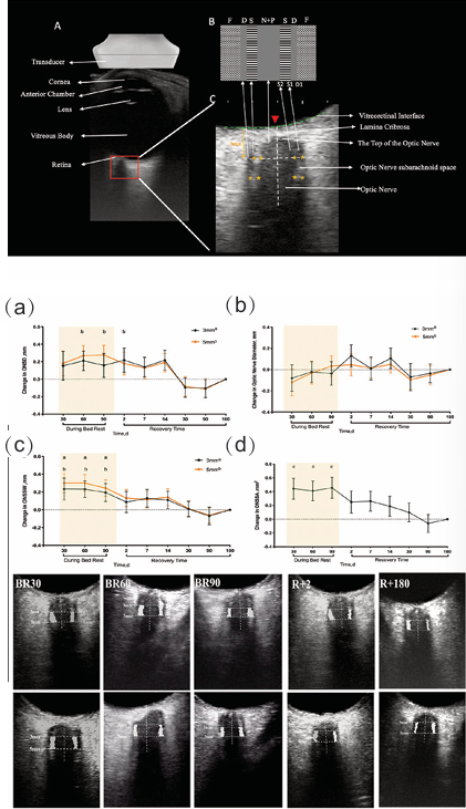 圖為經(jīng)眶B超視神經(jīng)鞘測量模式圖,長期失重導(dǎo)致視神經(jīng)鞘持續(xù)增寬。