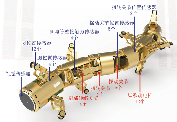 圖為空間站管道檢測機(jī)器人結(jié)構(gòu)、傳感器以及自由度配置。