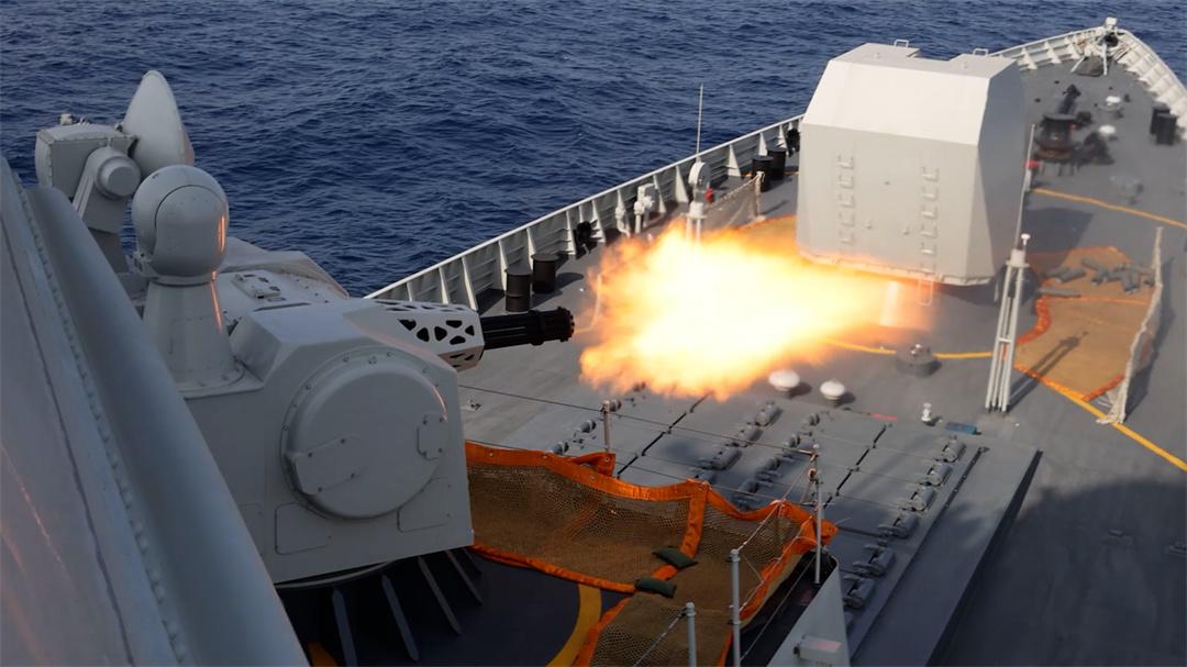 圖為包頭艦防空反導演練,副炮射擊。熊勤鑫 攝