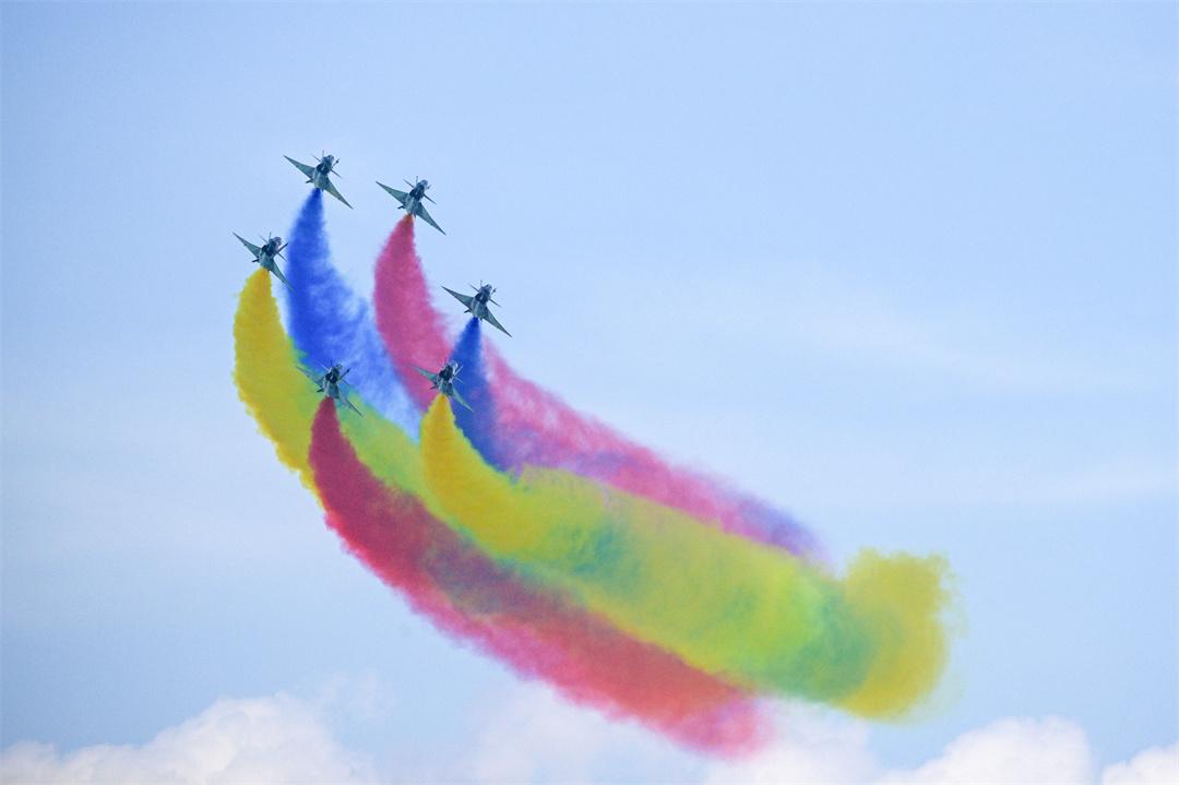 隨后,六機斤斗、單機小速度平飛、五機水平開花等高難度動作銜接行云流水、一氣呵成,鐵翼翱翔與柔美視覺有機融合,給現(xiàn)場觀眾帶去極具震撼的視覺盛宴。