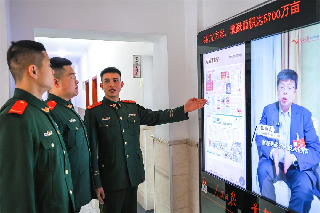 連日來(lái),該支隊(duì)緊貼任務(wù)實(shí)際,創(chuàng)新學(xué)習(xí)形式,推動(dòng)全國(guó)兩會(huì)精神直達(dá)基層、深入兵心。從機(jī)關(guān)到基層,從干部到戰(zhàn)士,官兵們通過電視直播、報(bào)刊閱讀、網(wǎng)絡(luò)學(xué)習(xí)等多種渠道實(shí)時(shí)跟進(jìn)兩會(huì)動(dòng)態(tài),深刻領(lǐng)會(huì)精神實(shí)質(zhì);積極構(gòu)建視、聽、讀、議立體學(xué)習(xí)矩陣,從新媒體平臺(tái)實(shí)時(shí)推送,到利用政工平臺(tái)整合“三個(gè)半小時(shí)”打造的線上線下全媒體課堂,再到依托信息櫥窗、主題板報(bào)營(yíng)造“處處能學(xué)”氛圍,官兵們通過多渠道實(shí)現(xiàn)學(xué)習(xí)同頻共振、全員覆蓋?;鶎訂挝涣⒆銓?shí)際積極開設(shè)“士兵講堂”,遴選訓(xùn)練尖兵、理論骨干組成宣講小隊(duì),結(jié)合從軍經(jīng)歷、訓(xùn)練任務(wù)以及家鄉(xiāng)發(fā)展變化,分享自己對(duì)兩會(huì)精神的獨(dú)特見解和熱點(diǎn)詞匯。官兵們談體會(huì)、話使命、謀發(fā)展,在思想碰撞中凝聚奮斗強(qiáng)軍共識(shí),筑牢鐵心向黨的思想根基。
