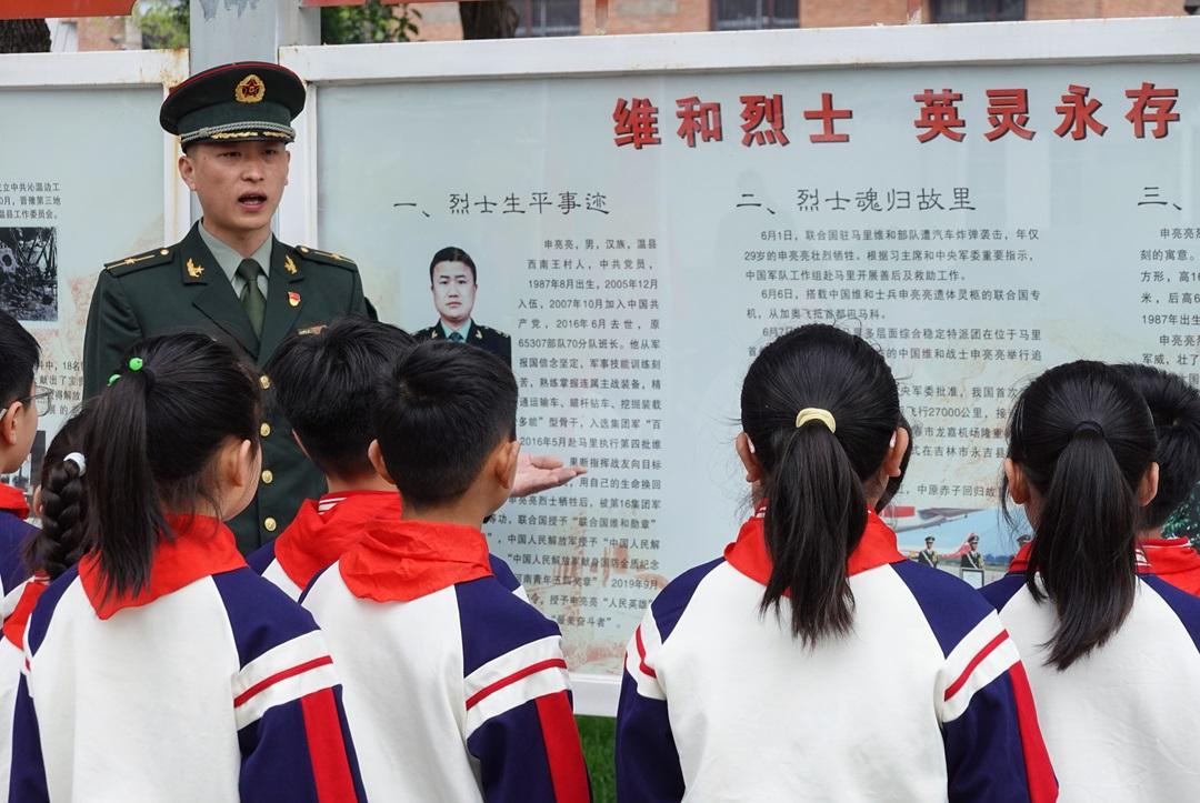 該旅駐地烈士陵園,每年有數(shù)萬人次來到這里,緬懷為維護世界和平犧牲的“人民英雄”。講解員張碩對前來參觀的學(xué)生們說:“申亮亮是部隊的英雄,也是我們心中的英雄?!?/p>