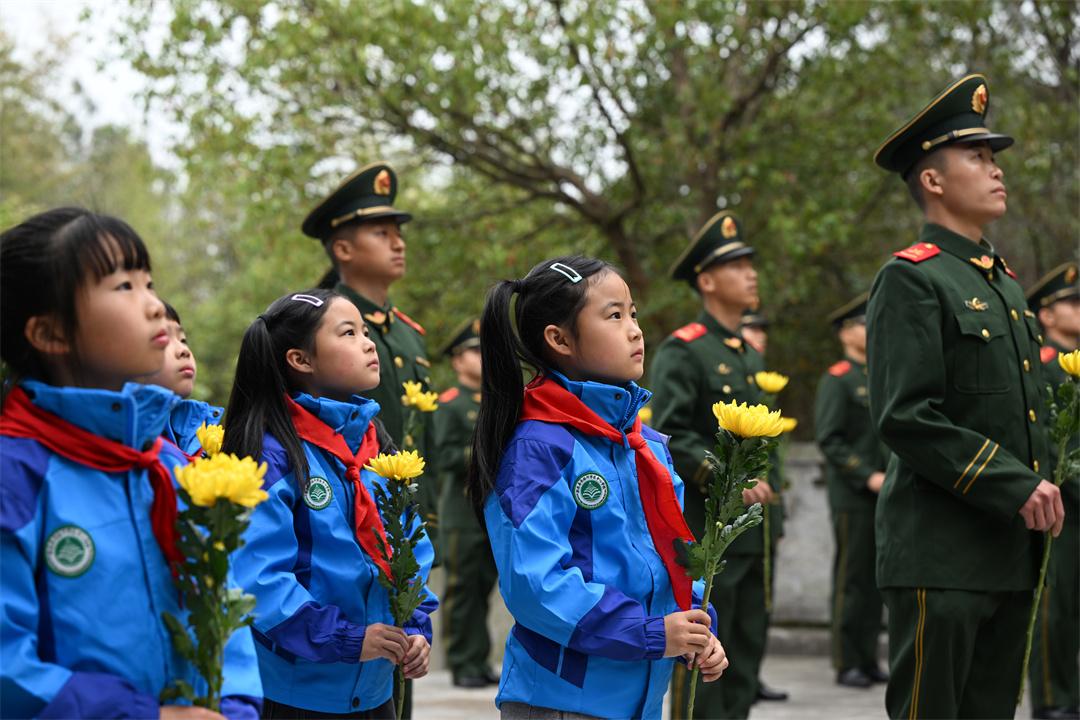 圖為官兵和學生們瞻仰烈士紀念碑。