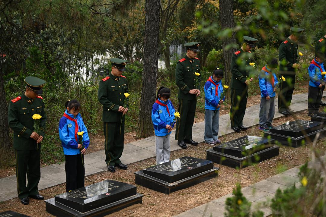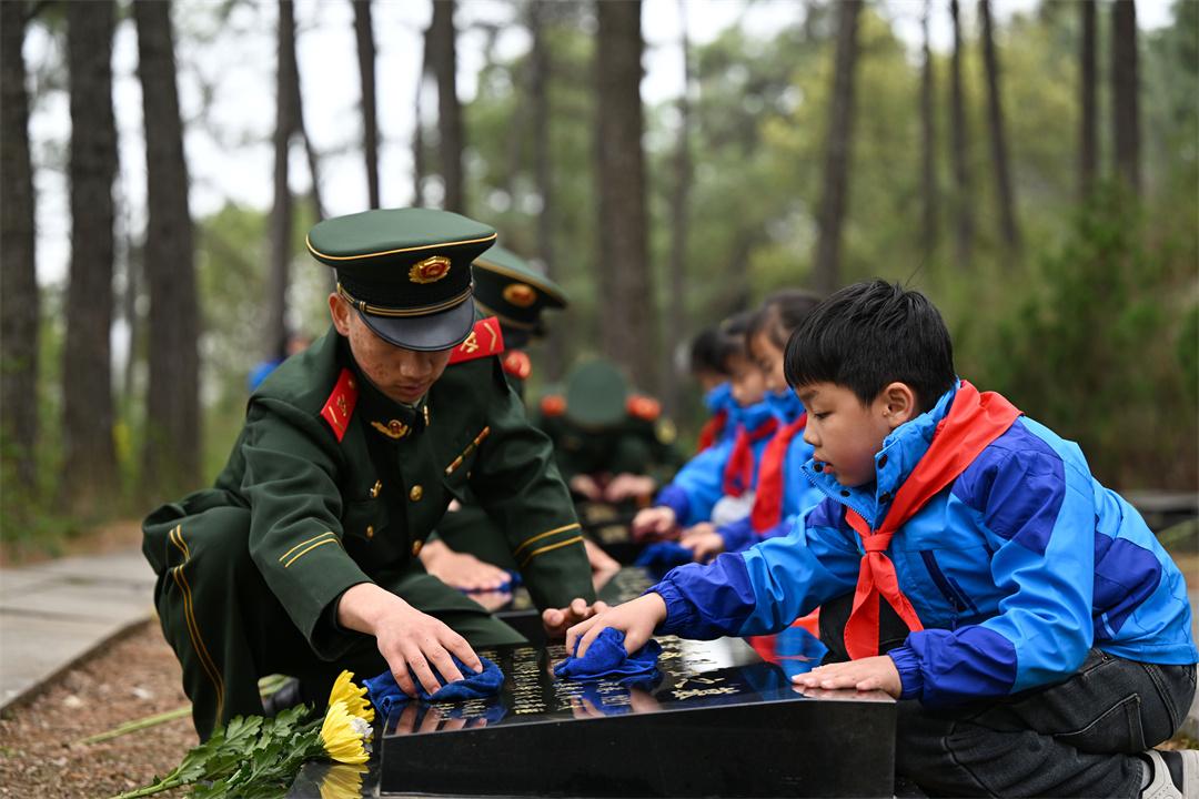 圖為官兵和學生們一起小心翼翼地擦拭烈士墓碑。