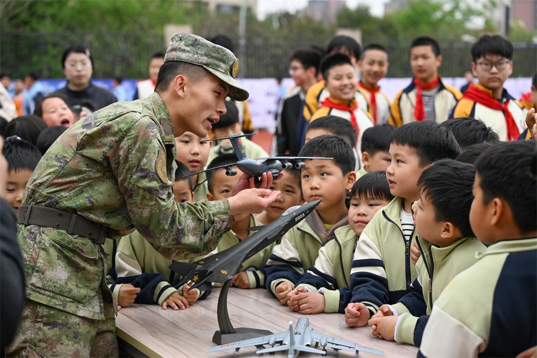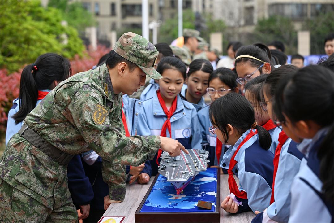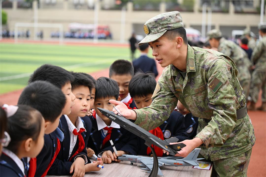 圖為官兵向小學(xué)生介紹裝備模型。