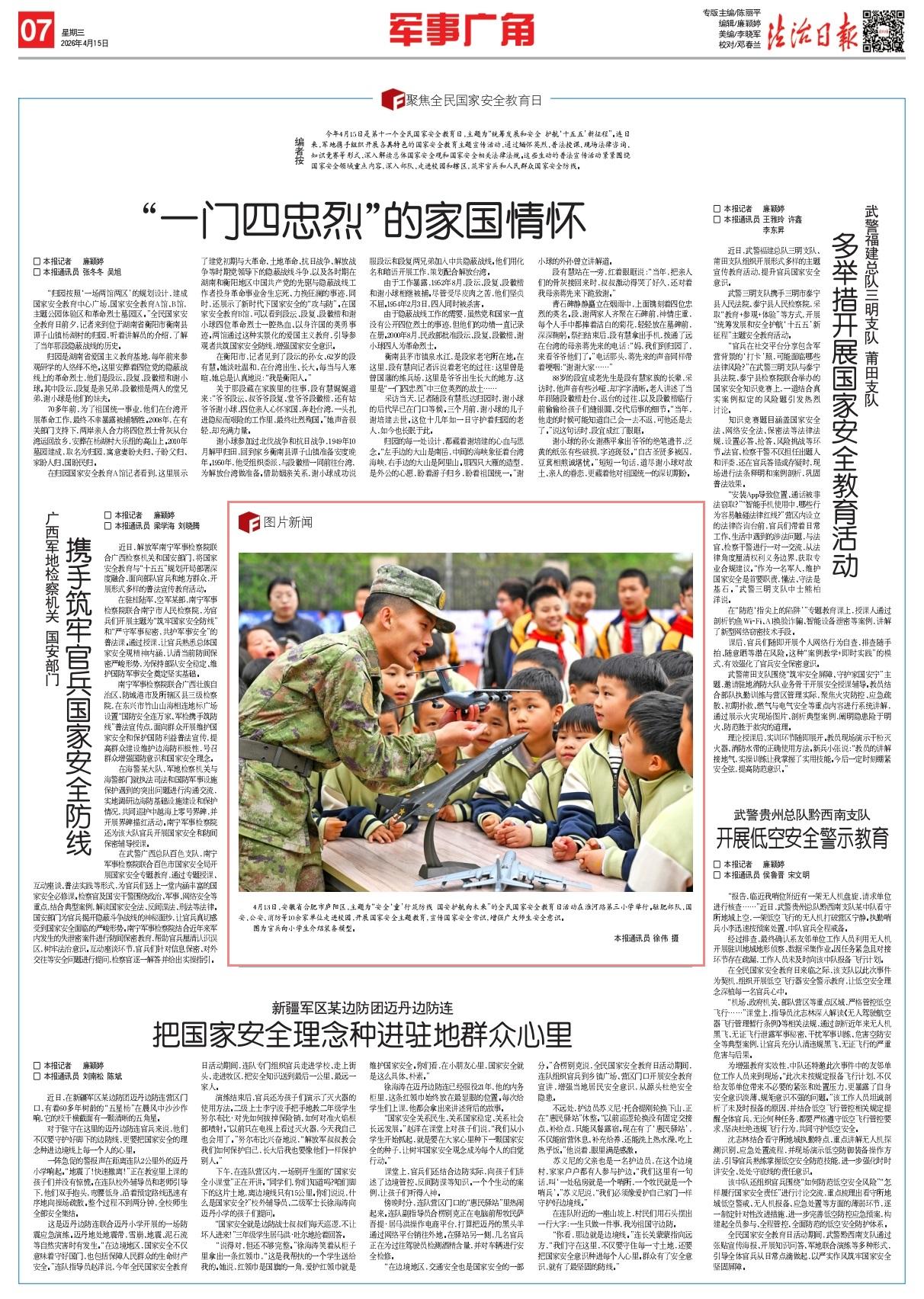4月13日,安徽省合肥市廬陽區(qū),主題為“安全‘童’行筑防線 國安護(hù)航向未來”的全民國家安全教育日活動(dòng)在淮河路第三小學(xué)舉行。駐肥部隊(duì)、國安、公安、消防等10余家單位走進(jìn)校園,開展國家安全主題教育,宣傳國家安全常識(shí),增強(qiáng)廣大師生安全意識(shí)。