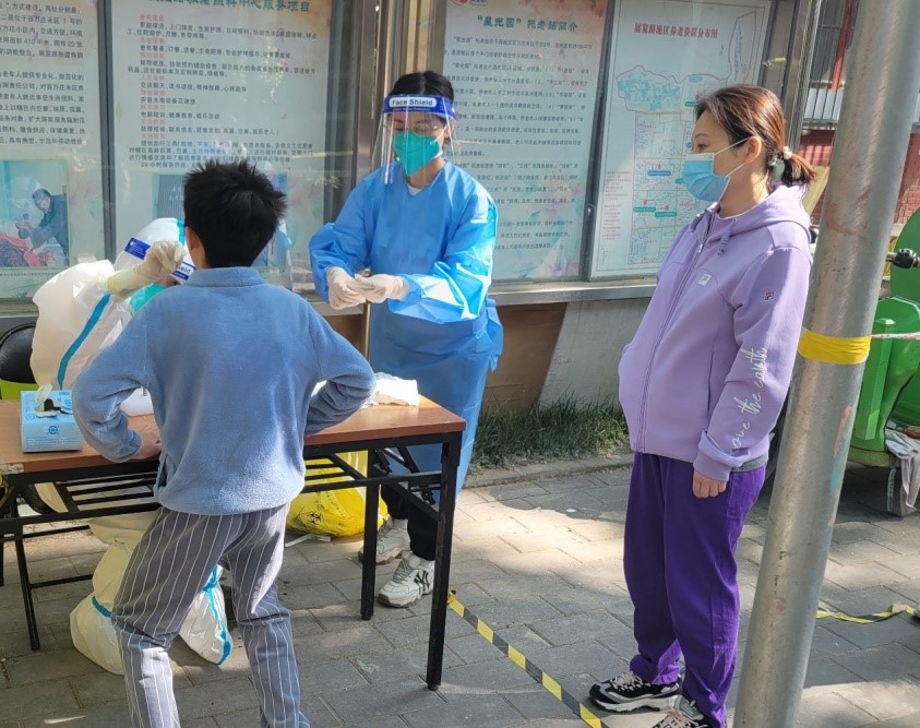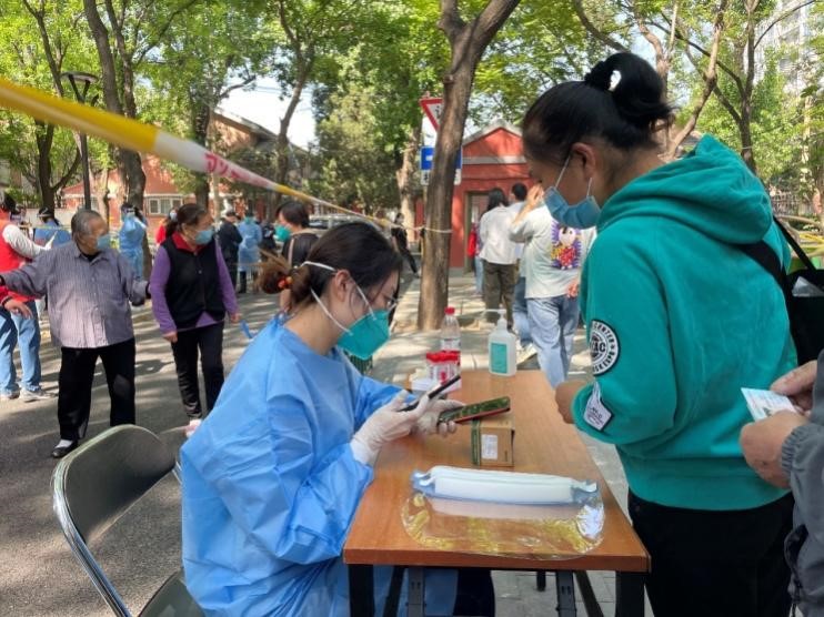 5月3日早6點(diǎn),我和院里一行18名志愿者已在百萬莊社區(qū)集結(jié)就位了。登記身份信息、引導(dǎo)排隊(duì)秩序、解答群眾疑問……對(duì)于這些流程,志愿者們都已經(jīng)非常熟練,我和小伙伴們默契地迅速就位,投入了工作。今天,為了提高檢測(cè)效率,我領(lǐng)到了“高級(jí)任務(wù)”:協(xié)助醫(yī)生開展采樣。