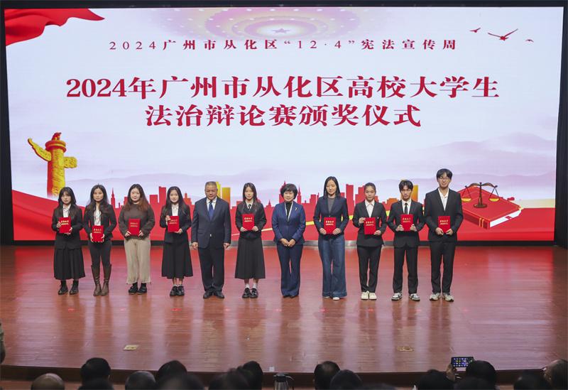 廣州南方學(xué)院的開場(chǎng)舞蹈《溯源》以獨(dú)特的藝術(shù)形式,展現(xiàn)了法治文化的深厚底蘊(yùn);從化區(qū)委政法委、區(qū)檢察院、區(qū)法院、區(qū)司法局、區(qū)公安分局的青年們帶來了朗誦節(jié)目《憲法頌》,傳遞出對(duì)憲法的崇高敬意和堅(jiān)定信仰;舞蹈《這一束光》則將抽象的憲法知識(shí)轉(zhuǎn)化為具象的舞蹈形象,讓孩子們用身體語言表達(dá)對(duì)憲法的理解和感悟;快板音樂劇《跟我一起學(xué)憲法》,巧妙融合了傳統(tǒng)快板藝術(shù)與現(xiàn)代教育理念,以生動(dòng)活潑的形式引領(lǐng)大家走進(jìn)憲法的神秘殿堂。最后,歌曲《歌唱祖國》將全場(chǎng)氣氛推向了高潮。除了文藝表演,當(dāng)天還舉辦了“2024年度廣州市從化區(qū)高校大學(xué)生法治辯論賽”頒獎(jiǎng)活動(dòng),9所高校代表、9名優(yōu)秀指導(dǎo)老師、11名優(yōu)秀辯手上臺(tái)領(lǐng)獎(jiǎng)。