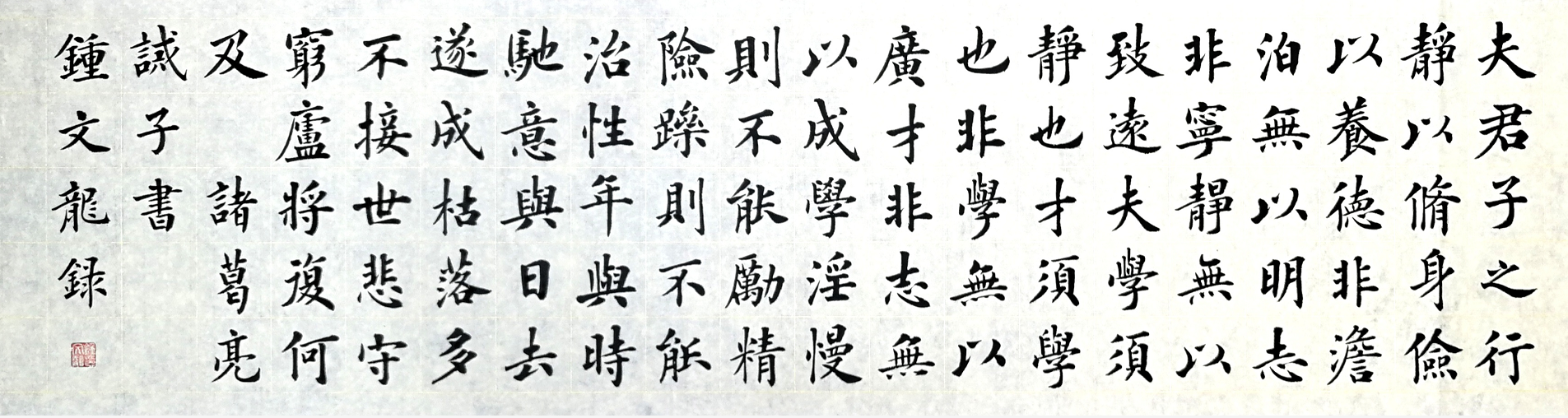 如何將家庭教育與書法有機結合?鐘文龍?zhí)剿鞒隽艘粭l用楷書書寫歷朝傳世家訓名篇的道路,他在不斷書寫《顏氏家訓》《家范》《誡子書》《朱子家訓》等歷朝傳世家訓名篇的過程中,逐漸感悟到通過楷書來書寫家訓,并在家中進行懸掛,可以起到潤物無聲潛移默化的激勵匡正等教育作用。