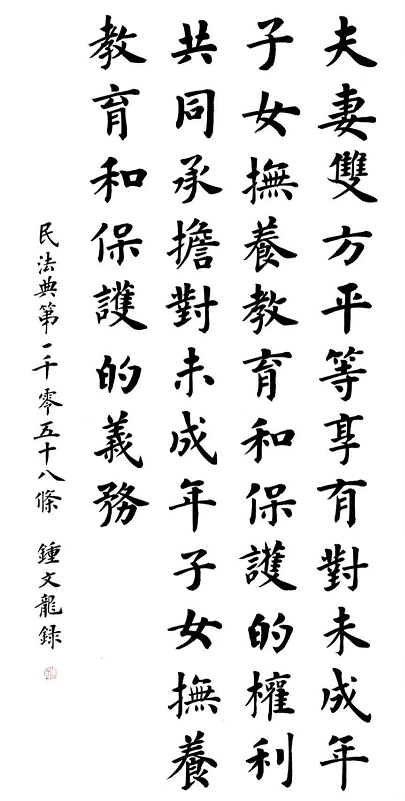 2020年7月11日,司法部普法與依法治理局和法制日報社共同主辦了“書·法”系列活動。鐘文龍先生應邀書寫民法典第一千零五十八條: “夫妻雙方平等享有對未成年子女撫養(yǎng)、教育和保護的權利,共同承擔對未成年子女撫養(yǎng)、教育和保護的義務。”因其作品周正雅致而頗受好評。