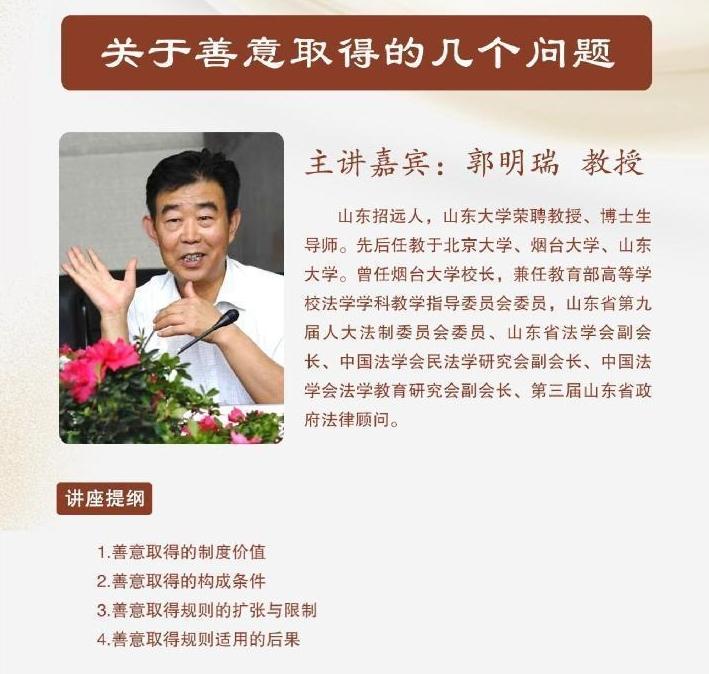 中國石油大學(xué)(華東)第八期 “石大人文講壇”邀請中國法學(xué)會(huì)民法學(xué)研究會(huì)副會(huì)長,煙臺(tái)大學(xué)原校長郭明瑞教授圍繞“關(guān)于善意取得的幾個(gè)問題”,將于4月15日在中國石油大學(xué)(華東)逸夫樓一樓報(bào)告廳開講。