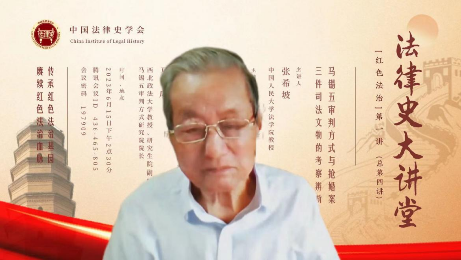 6月15日,由中國(guó)法律史學(xué)會(huì)主辦的法律史大講堂“紅色法治”系列第一講(總第四講)舉行。中國(guó)人民大學(xué)法學(xué)院張希坡教授以“馬錫五審判方式與‘搶婚案’三件司法文物的考察辨析”為題主講,重點(diǎn)講述了兩方面內(nèi)容:其一,馬錫五簡(jiǎn)歷及馬錫五審判方式產(chǎn)生的社會(huì)歷史根源;其二,關(guān)于“搶婚案”的三件司法文物的考察辨析。講座由中國(guó)人民大學(xué)法學(xué)院馬小紅教授主持,黑龍江大學(xué)法學(xué)院孫光妍教授、西北政法大學(xué)馬錫五審判方式研究院馬成教授作為與談嘉賓發(fā)言。