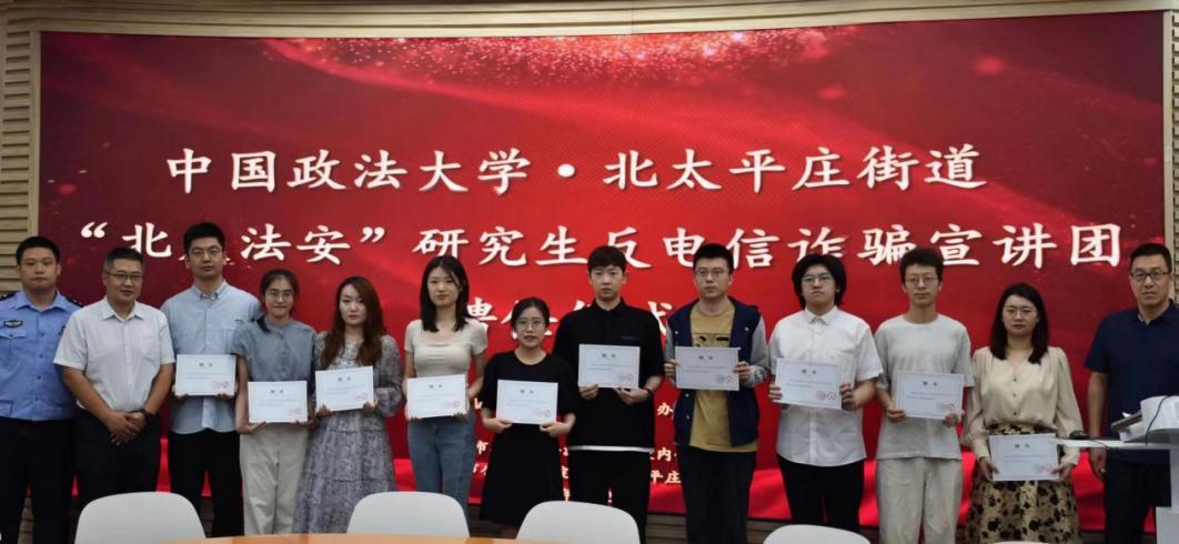 為進(jìn)一步加強(qiáng)與完善研究生社會(huì)實(shí)踐育人體系,引導(dǎo)和鼓勵(lì)中國政法大學(xué)研究生發(fā)揮專業(yè)優(yōu)勢,深入基層實(shí)踐,服務(wù)基層法治建設(shè),今年3月,中國政法大學(xué)研究生工作辦公室、刑事司法學(xué)院聯(lián)合北京市公安局海淀分局北太平莊派出所共同組建“北太法安”中國政法大學(xué)研究生反電信詐騙宣講團(tuán)。6月28日,"北太法安"研究生反電信詐騙宣講團(tuán)聘任儀式在中國政法大學(xué)學(xué)院路校區(qū)舉行。