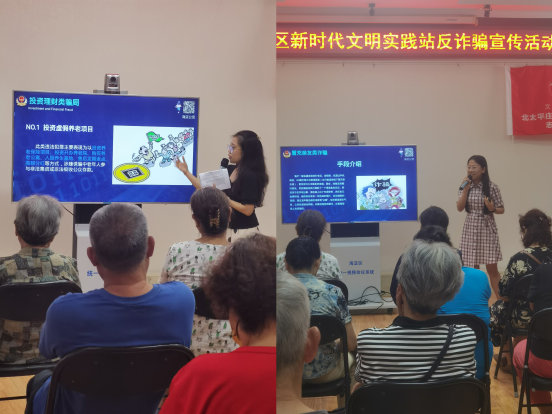 宣講團成員王舒琦、李成秀在北京市海淀區(qū)北太平莊街道明光北里社區(qū)的社區(qū)活動中為老年人們進行了防范養(yǎng)老詐騙宣傳。兩位同學結合類型分析與實務案例,重點介紹了誘導消費類、投資理財類、養(yǎng)老保險類等典型騙局的詐騙方式,分享了針對性的防范路徑與預防措施,并給出了具體的防范建議。兩位同學的講解幫助老年人充分認識到防范詐騙的重要性,樹立了反詐意識,了解了防詐知識。
