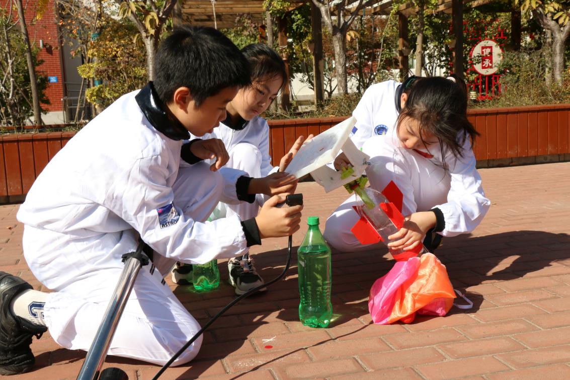 10月27日,一艘艘“水火箭”在北京市朝陽區(qū)將府實(shí)驗(yàn)學(xué)校(以下簡(jiǎn)稱將府學(xué)校)操場(chǎng)北側(cè)凌空飛起,孩子們的航天夢(mèng)、科技?jí)粢搽S之起飛……