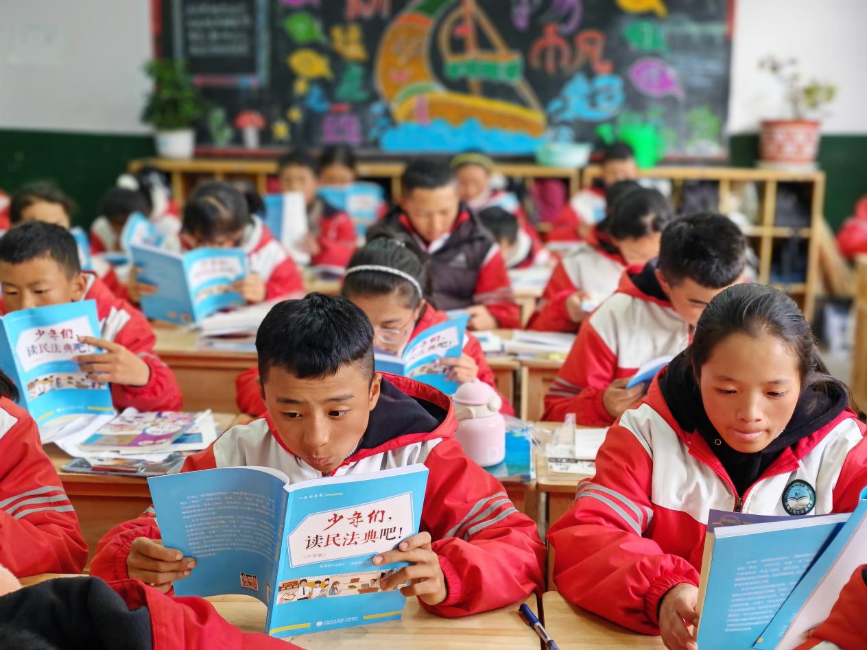 西藏自治區(qū)林芝市工布江達縣中學學生在閱讀《少年們,讀民法典吧!》