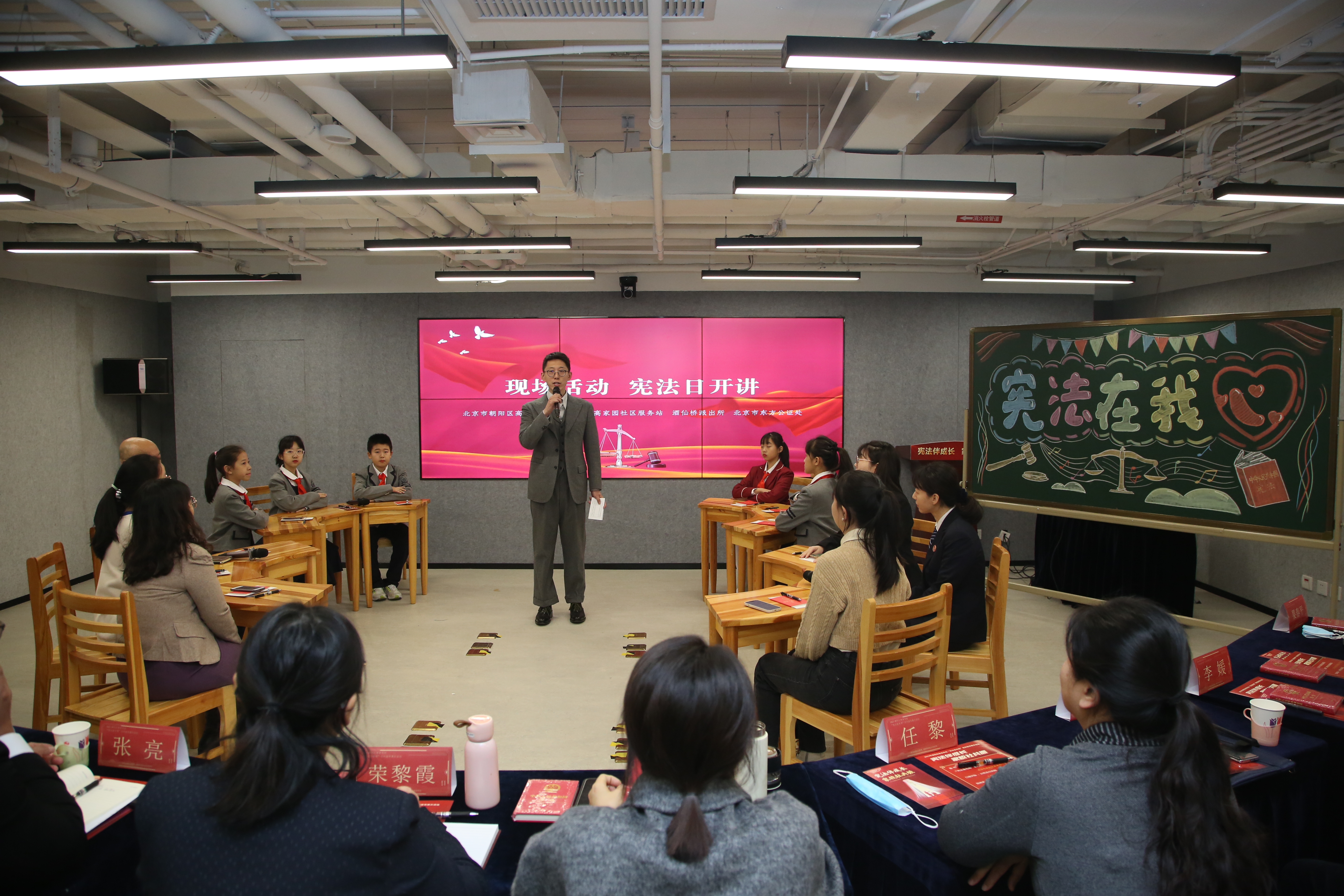 12月3日,北京市朝陽區(qū)高家園小學與將臺路小學及社區(qū)聯(lián)手,共同舉辦了“憲法伴成長 家校社共振”主題現(xiàn)場活動。高家園小學張弜老師帶領(lǐng)大家走進憲法“講堂”。