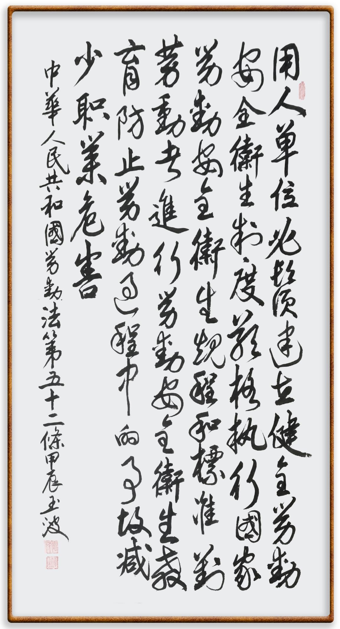 法律,是勞動(dòng)者奮斗前行的后盾。在“五一”國(guó)際勞動(dòng)節(jié)這個(gè)崇尚勞動(dòng)、贊美勞動(dòng)者的日子里,“書(shū)·法”系列活動(dòng)邀請(qǐng)書(shū)法家及書(shū)法愛(ài)好者們將筆端對(duì)準(zhǔn)《中華人民共和國(guó)勞動(dòng)法》,共同書(shū)寫(xiě)新時(shí)代勞動(dòng)者新的榮光!