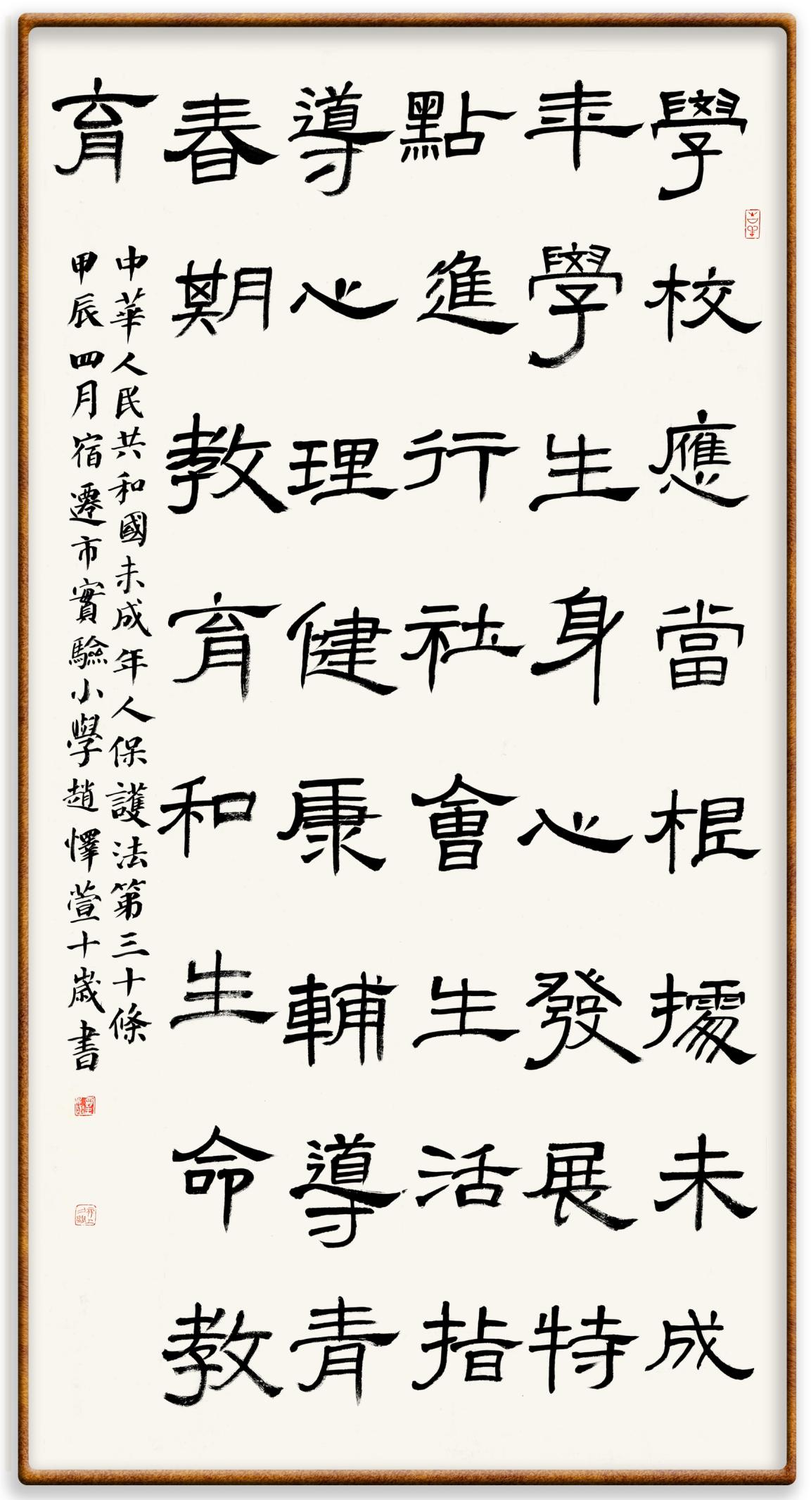 “六一”國(guó)際兒童節(jié)來(lái)臨之際,法制日?qǐng)?bào)社聯(lián)合(全國(guó))教育書(shū)畫(huà)協(xié)會(huì)基礎(chǔ)書(shū)法教育分會(huì),推出“‘書(shū)·法’系列活動(dòng)之書(shū)寫(xiě)《中華人民共和國(guó)未成年人保護(hù)法》活動(dòng)”,邀請(qǐng)小朋友書(shū)寫(xiě)部分法條,讓孩子們?cè)跐鉂獾墓?jié)日氛圍中感受傳統(tǒng)文化的獨(dú)特魅力。