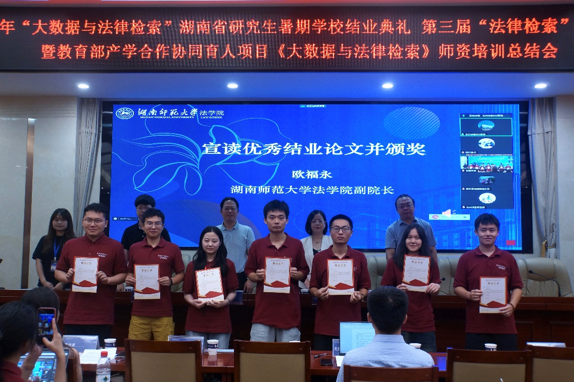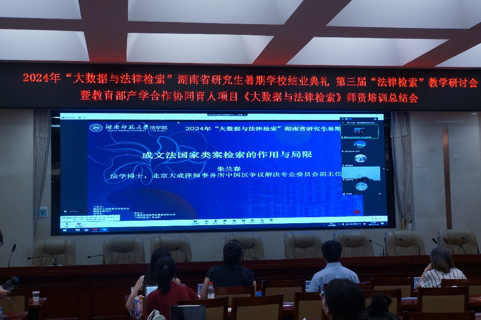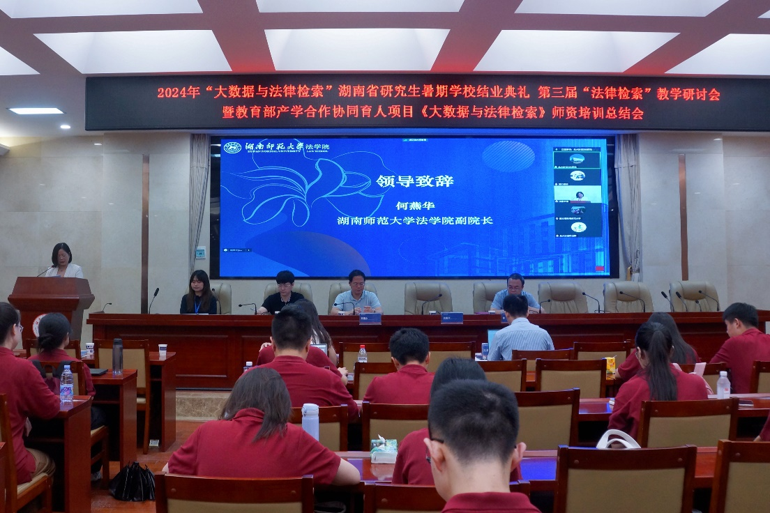 7月28日上午,2024“大數(shù)據(jù)與法律檢索”湖南省研究生暑期學校結業(yè)典禮、第三屆“法律檢索”教學研討會暨教育部產(chǎn)學合作協(xié)同育人項目《大數(shù)據(jù)與法律檢索》師資培訓總結會在湖南師范大學法學院舉行,湖南師范大學法學院副院長何燕華、湖南師范大學法學院副院長歐福永、湖南師范大學法學院副教授黃文旭、本次暑期學校班主任李部(北大法寶學堂)、湖南師范大學法學院法碩辦輔導員羅昊、大連財經(jīng)學院教師王杰彥、武漢東湖學院教師王建東、大連海事大學法學院教師吳淞豫及線上嘉賓廣東外語外貿(mào)大學教授曾赟、北大法寶副總經(jīng)理何遠瓊博士出席本次結業(yè)典禮。湖南師范大學法學院研究生工作辦公室主任王丹主持本次結業(yè)典禮。