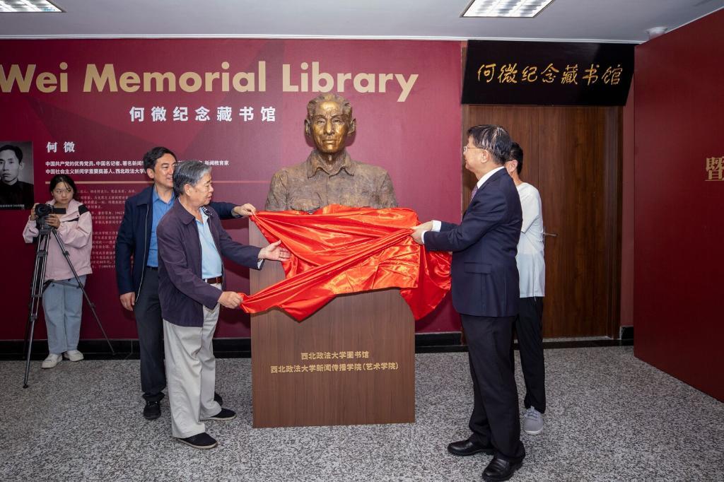 西北政法大學黨委副書記、校長范九利,人民日報出版社總編輯丁丁,新華社寧夏分社、吉林分社原社長申尊敬,中國新聞史學會新聞傳播教育史研究會會長張昆,以及何微親屬代表張振林等出席了揭幕儀式并致辭。西北政法大學黨委副書記、紀委書記、監(jiān)察專員劉志彬主持揭幕儀式。