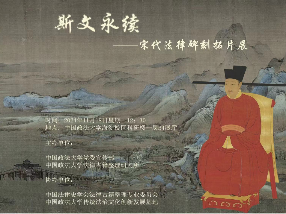 2024年11月18日,“斯文永續(xù)——宋代法律碑刻拓片展”在中國(guó)政法大學(xué)海淀校區(qū)開幕。本次展覽由中國(guó)政法大學(xué)黨委宣傳部、中國(guó)政法大學(xué)法律古籍整理研究所主辦,中國(guó)法律史學(xué)會(huì)法律古籍整理專業(yè)委員會(huì)、中國(guó)政法大學(xué)傳統(tǒng)法治文化創(chuàng)新發(fā)展基地協(xié)辦。這是自2017年以來(lái)中國(guó)政法大學(xué)舉辦第13場(chǎng)法制文物學(xué)術(shù)公益展覽。