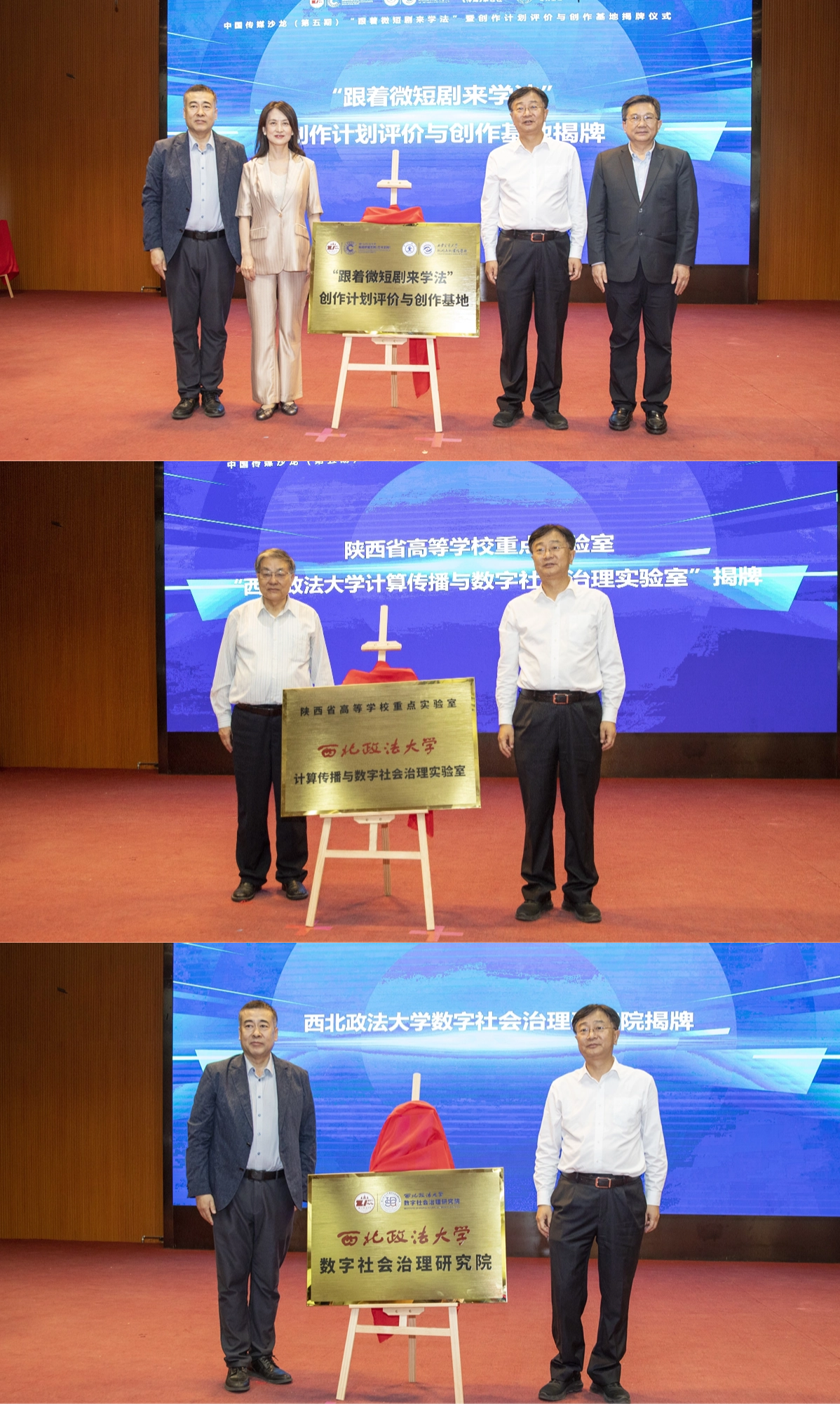 開幕式上,范九利與闞平共同為“跟著微短劇來學(xué)法”創(chuàng)作計(jì)劃評價(jià)與創(chuàng)作基地揭牌。隨后,孫憲忠與范九利為西北政法大學(xué)“計(jì)算傳播與數(shù)字社會治理陜西省高等學(xué)校重點(diǎn)實(shí)驗(yàn)室”揭牌,范九利與西北政法大學(xué)新聞傳播學(xué)院(藝術(shù)學(xué)院)院長孫江為西北政法大學(xué)數(shù)字社會治理研究院揭牌。該實(shí)驗(yàn)室及研究院將持續(xù)整合學(xué)校內(nèi)外法學(xué)、新聞傳播學(xué)與計(jì)算機(jī)科學(xué)資源,探索AI劇本生成、虛擬庭審場景等技術(shù)應(yīng)用,為普法宣傳提供技術(shù)支撐。