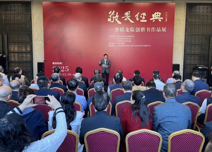12月20日,“敬畏經(jīng)典——羅殿龍臨創(chuàng)楷書作品展”在廣西書畫院美術(shù)館舉辦。本次展覽由中國文化藝術(shù)發(fā)展促進會、廣西法治文化研究會、廣西民族文化研究院主辦,廣西書法院承辦。開幕式上,廣西壯族自治區(qū)黨委原常委、宣傳部長黃道偉,中國文聯(lián)黨組原副書記、副主席覃志剛先后致辭。知名書法家、廣西壯族自治區(qū)高級人民法院原院長羅殿龍致答謝辭。廣西壯族自治區(qū)黨委原書記曹伯純宣布展覽開幕。開幕式由廣西書法院院長閉理書主持。