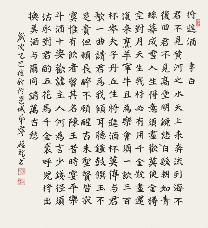 羅殿龍立足廣西地域和民族文化,積極推動“八桂書風”在新時代的傳承與發(fā)展,始終秉持“以筆修身,以墨潤心”的高潔志向,在書法藝術(shù)之路上不斷求索,力求精進。其作品結(jié)體端莊勻稱,章法疏朗有致,無刻意雕琢之痕,有自然天成之態(tài);筆鋒的剛勁,映其處事之堅毅;線條的溫潤,顯其為人之謙和;結(jié)體的規(guī)整,藏其履職之嚴謹。這種“書為心畫”的融合,讓臨帖不再是單純的技藝復刻,而是個人修為與文化素養(yǎng)的直觀呈現(xiàn),使每一幅作品都兼具藝術(shù)價值與精神內(nèi)涵——觀之既能感受楷法的正脈之美,更能體悟創(chuàng)作者的人格魅力。