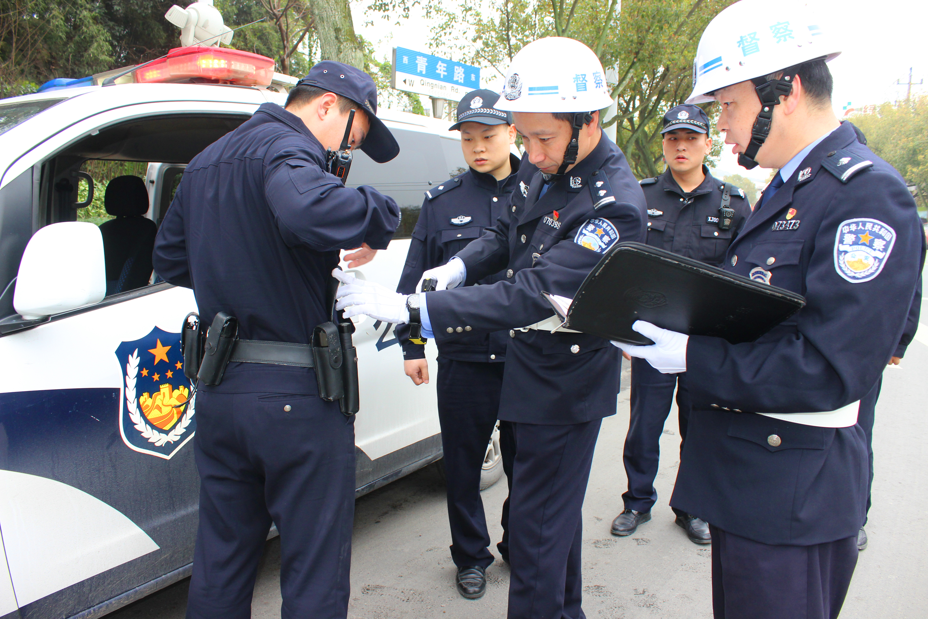 圖為督察民警在路上檢查警車。