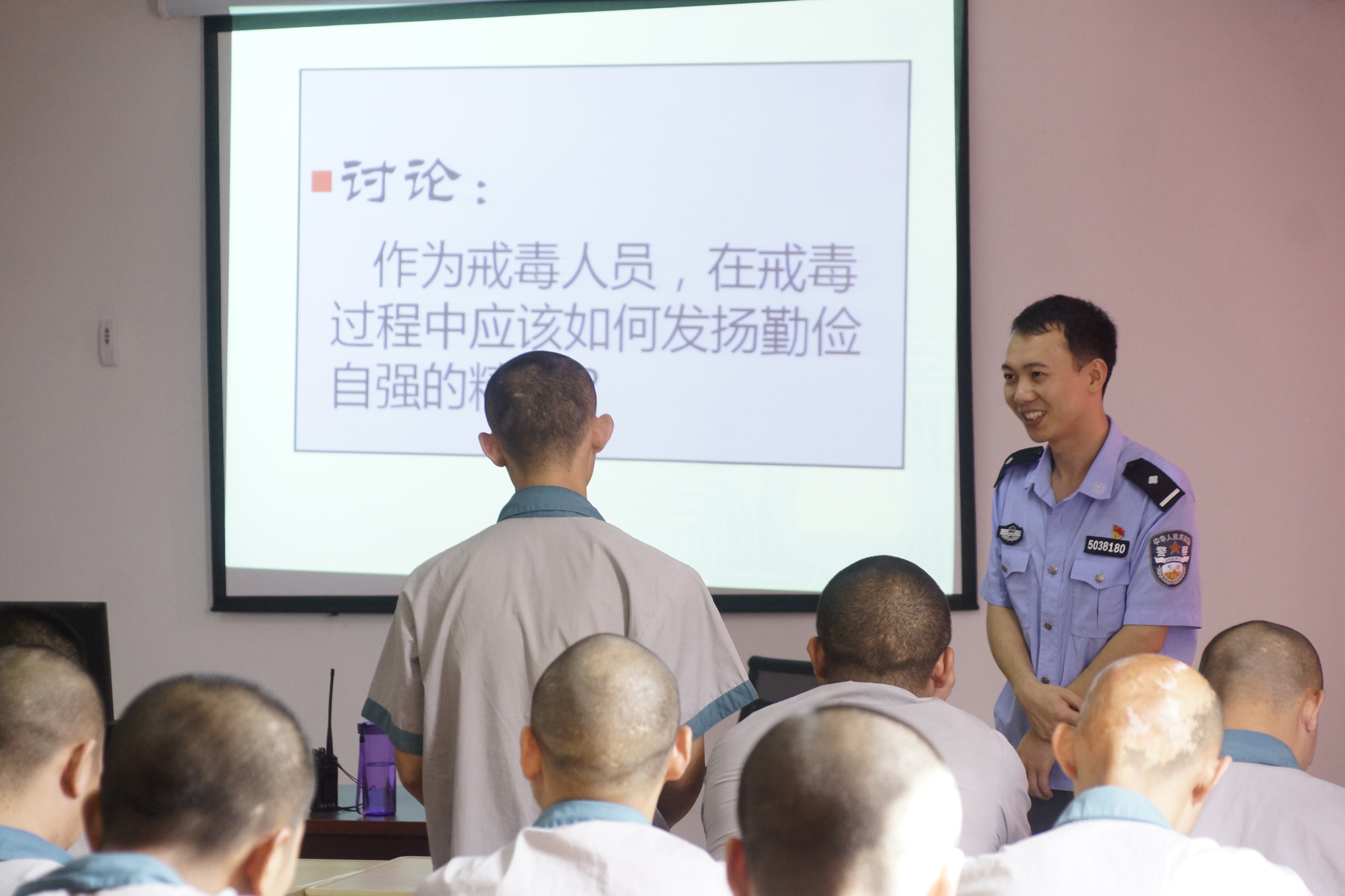教育矯正中心,課堂化教學(xué)中,戒毒人員回答民警教師提問(wèn)