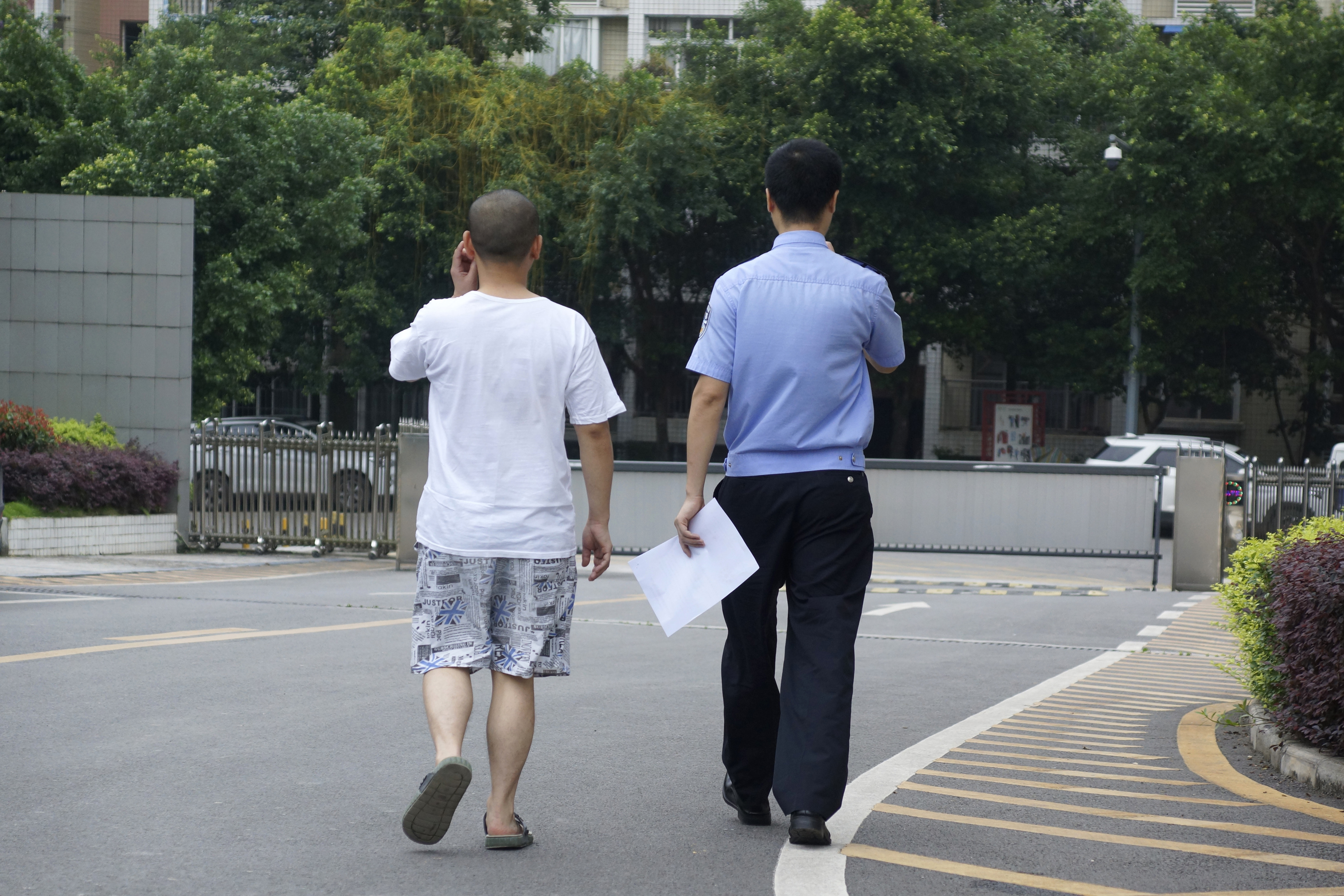 戒毒所大門口,一名戒毒人員兩年的隔離戒毒期滿,在民警護(hù)送下走出戒毒區(qū),走向新的生活