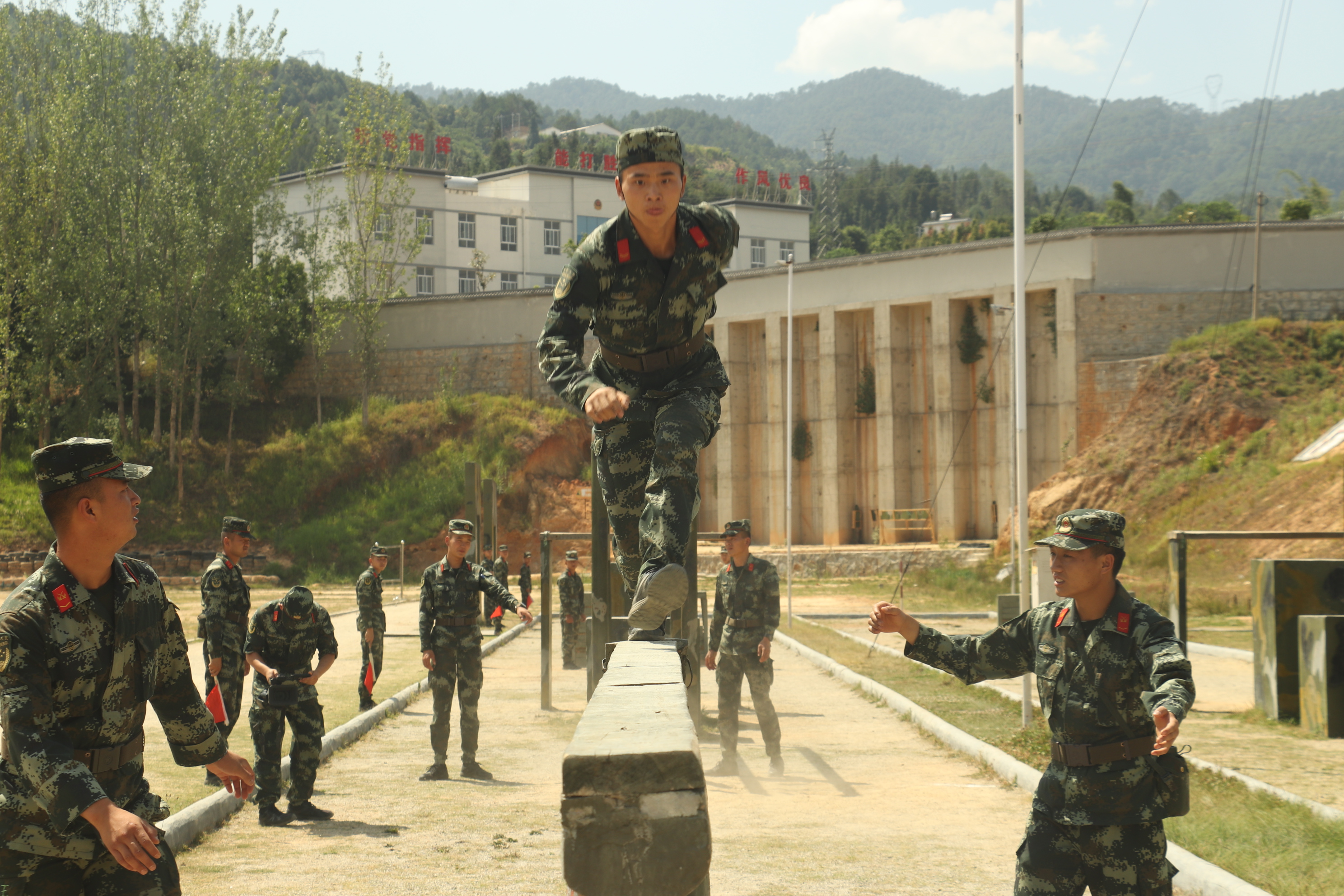 營區(qū)內(nèi),官兵們在跑道上跑步?jīng)_刺、器械場上肆意翻轉(zhuǎn)、障礙場上過矮墻跨壕溝......蛙跳、俯臥撐、平板支撐等各式體能訓(xùn)練都是官兵們的最愛。