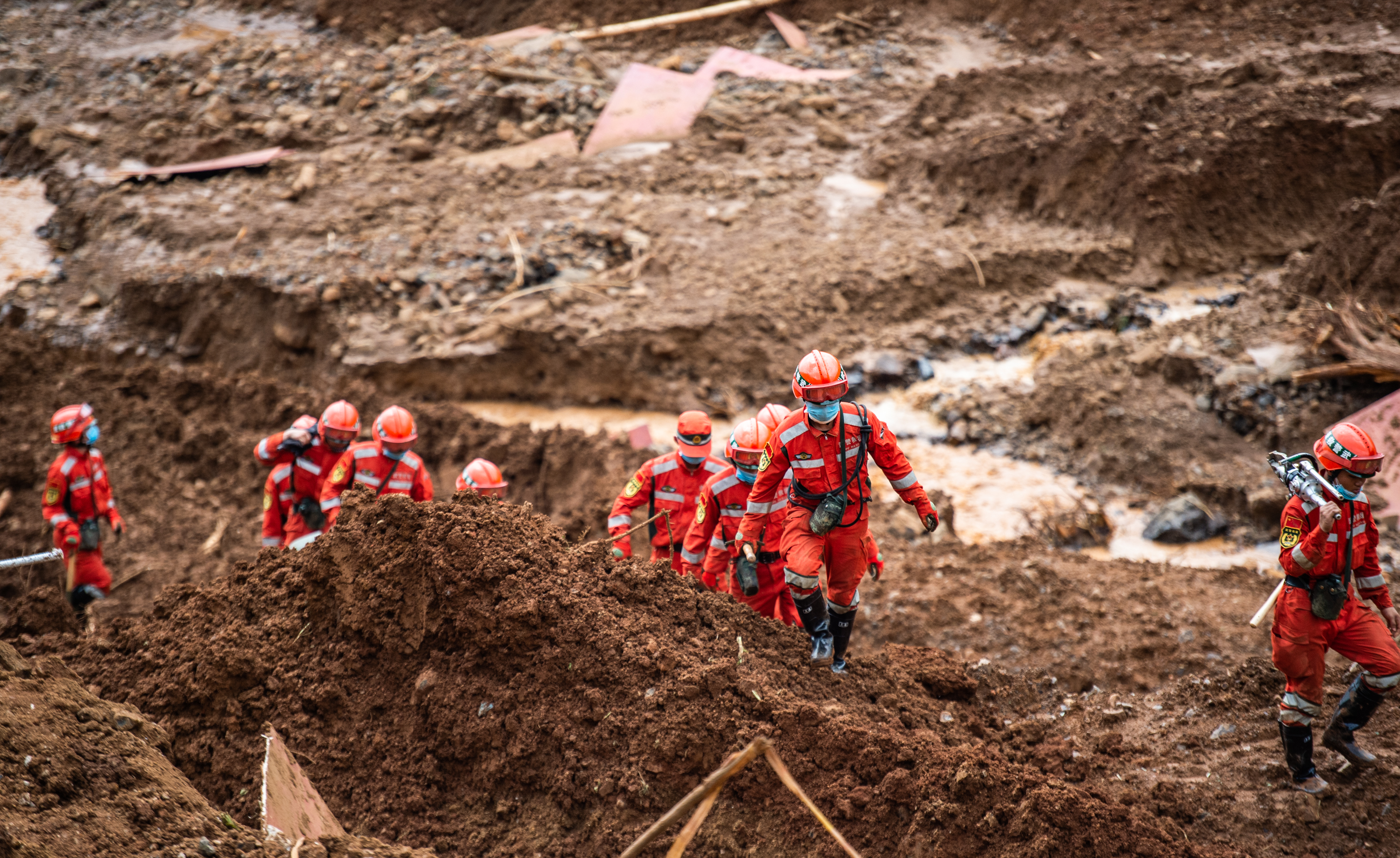 7月26日,救援人員進入山體滑坡現(xiàn)場進行搜救。