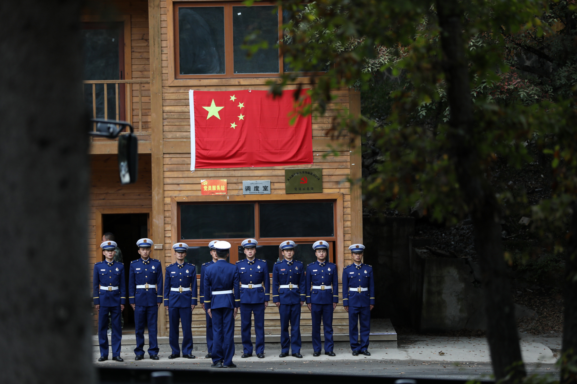 隊員們在景區(qū)調度室門前集合出發(fā)。