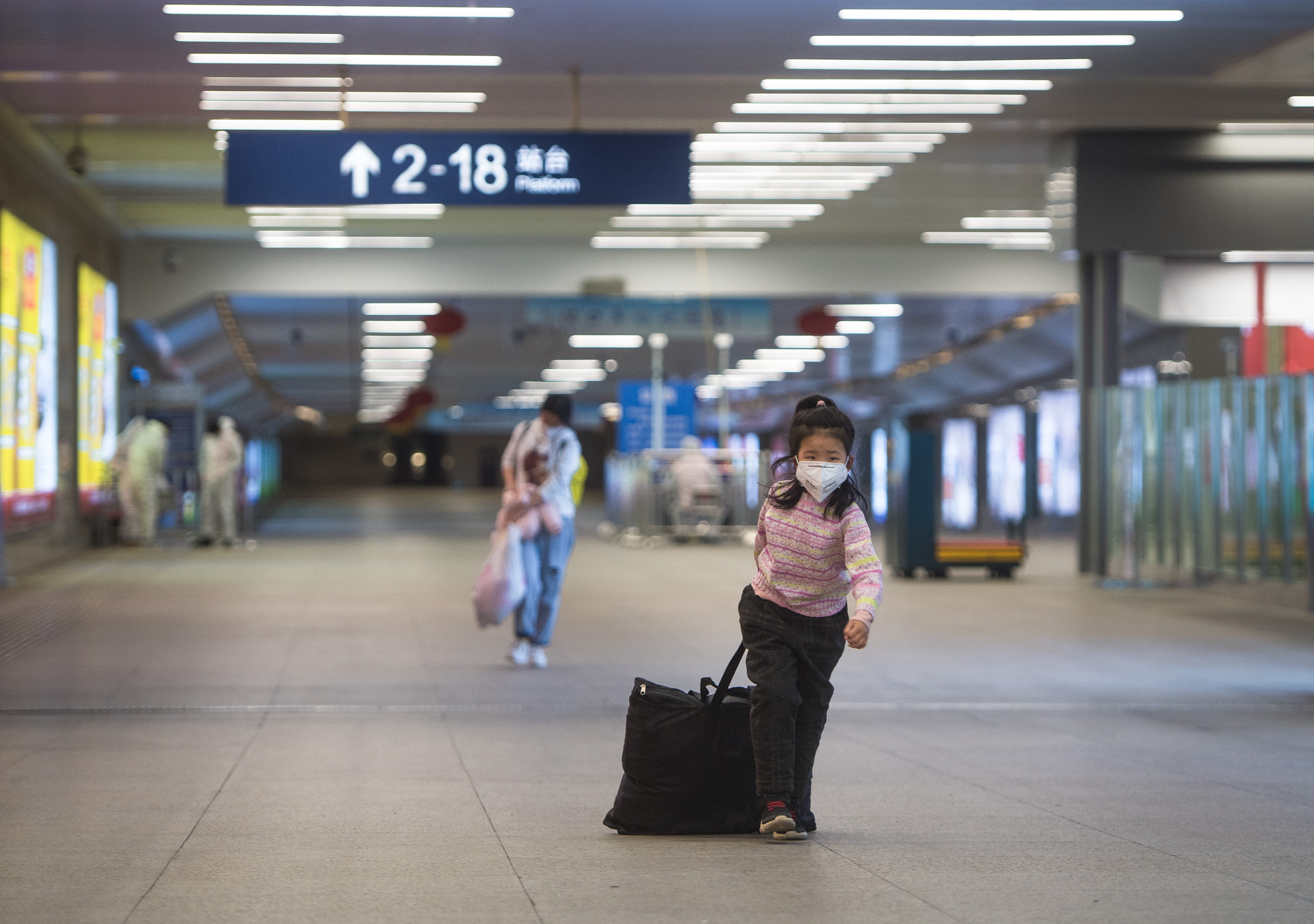 武漢恢復(fù)鐵路客站到達(dá)業(yè)務(wù)當(dāng)天,在武漢漢口火車站,一名小女孩拉著行李走在家長的前面(3月28日攝)。